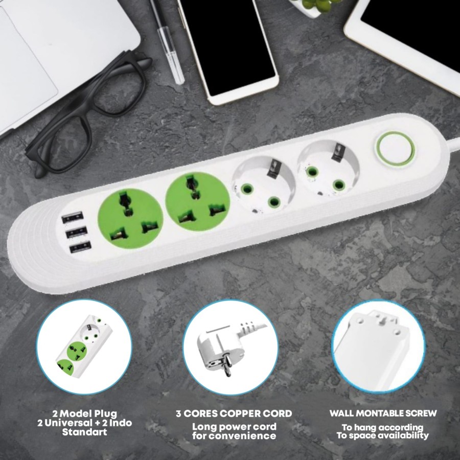 Lucky Hawk F01U 2M Power Strip Stop Kontak 4 Power Socket 3 USB Port