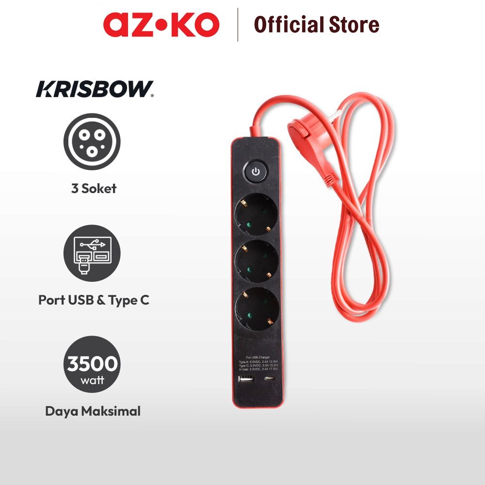 AZKO Krisbow Stop Kontak 3 Socket Dengan Port Usb & Type C - Merah Electric Socket Terminal Colokan Listrik Kotak Kontak Peralatan Elektronik