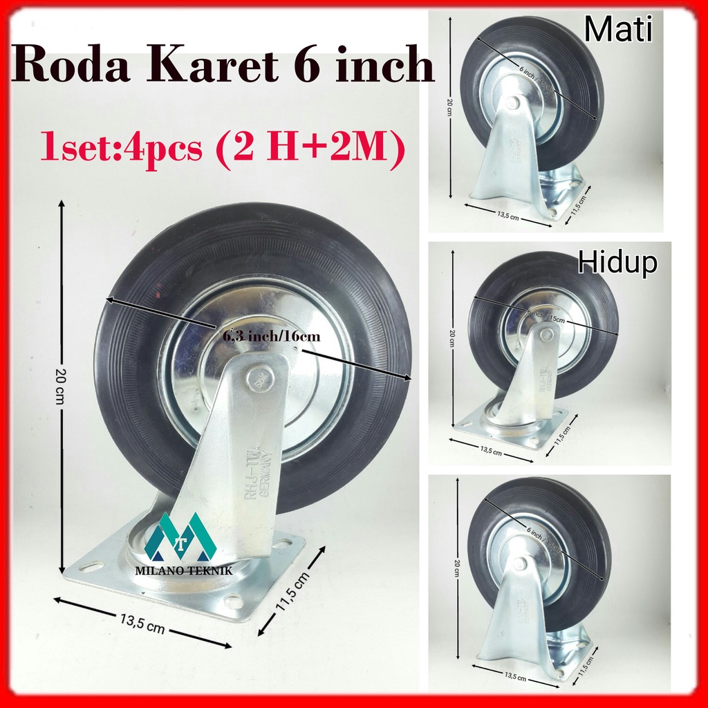 Roda troli 6inch (2H+2M) Roda Karet 6 inch Roda Gerobak Roda Etalase