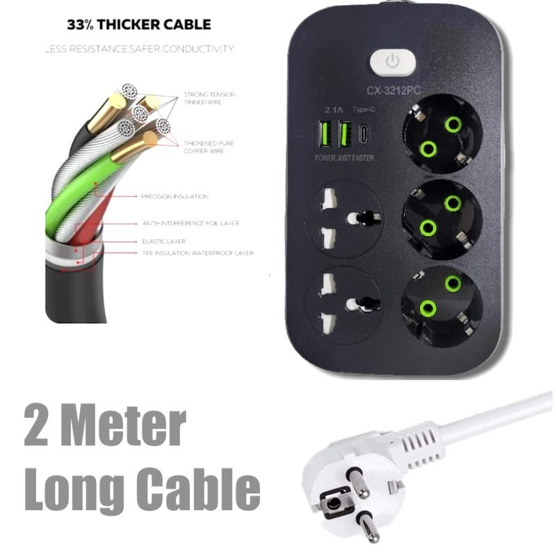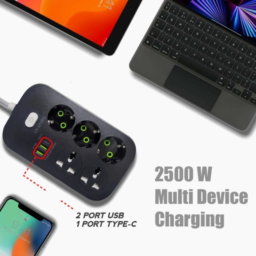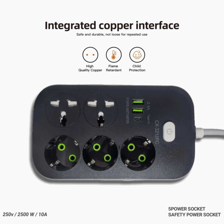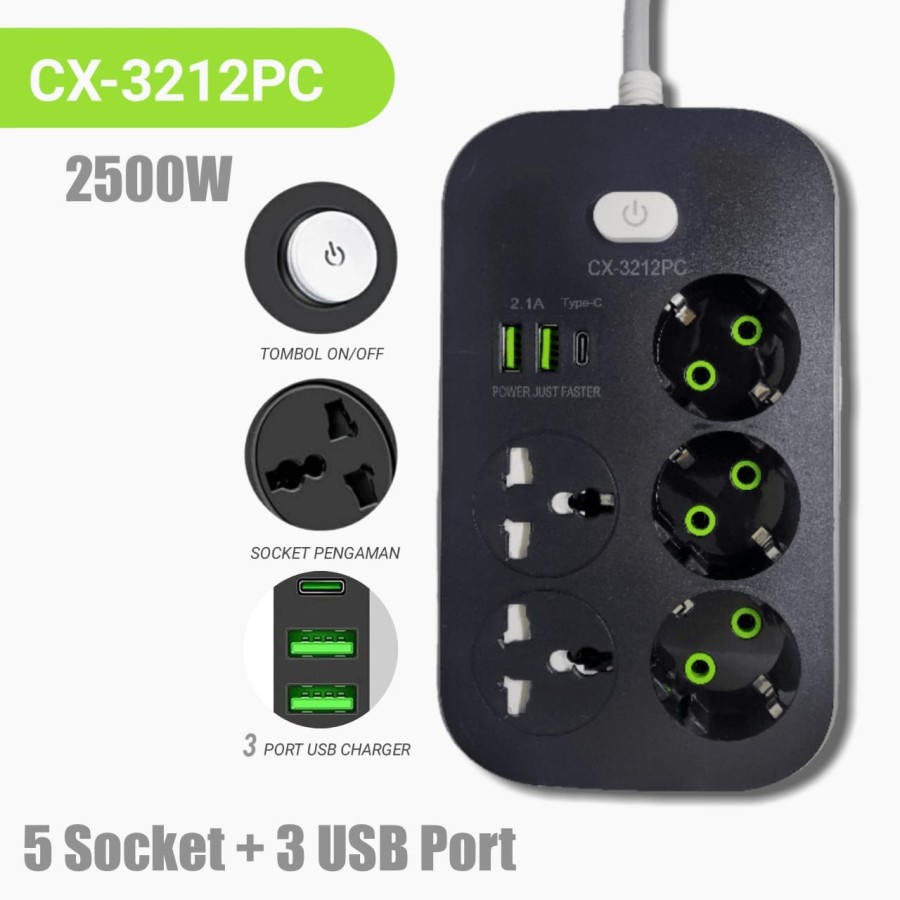 CX-3212PC Smart Power Strip Stop Kontak 5 Power Socket 3 USB Port 2M