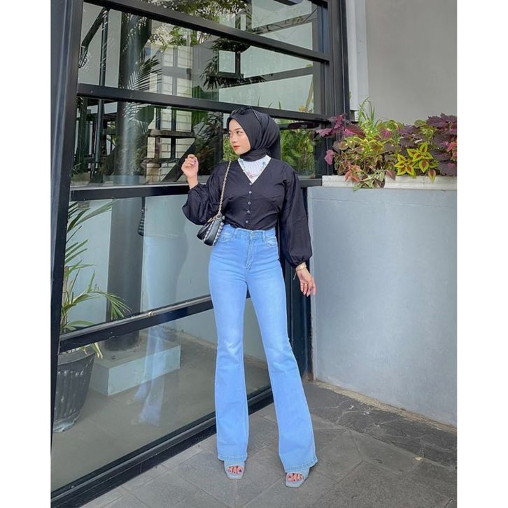 Higwaist Celana Cutbray Jeans Wanita loose Strecht