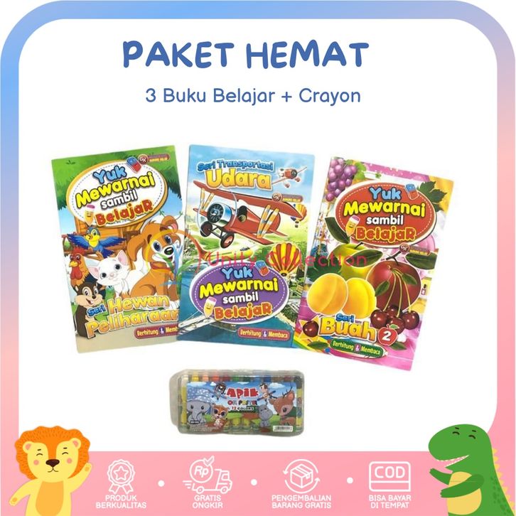 Paket Belajar Anak 3in1 - 3 Buku Mewarna Belajar Gratis Crayon Isi 12 Warna