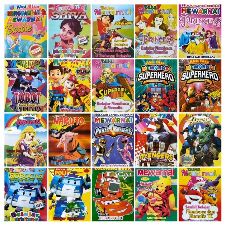 Avatar, Avengers, Barbie, Berdoa, Buah, Bunga, Cars, Cinamoroll, Dinosaurus, Doraemon, Frozen, Hello Kitty, Hewan, Hewan Laut, Huruf/Angka Hijaiyah, Kuda Pony, Kuromi, Labubu, Naruto, Paw, Power Rangers, Princess, Robocar, Robot Keren, Sayuran, Shiva, Super Wings, Supergirl, Superhero, Tobot, Winnie The Pooh, Wudhu