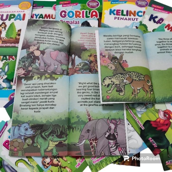 Ajing & Ayam, Angsa Bertelur Emas, Ayam bertanduk, Bangau Tkng Adu, Beruang dan Anaknya, Buaya Rakus, Burung Onta Kasuari, Derita Lalat, Gorila pemalas, KATAK baik Hati, Kancil & Buaya, Katak yg Nakal, Kecerdikan Landak, Kelelawar yg licik, Kelinci & Ayam, Kelinci Penakut, Keluarga Baru Gajah, Kenakalan Anak Tupai, Kerbau Katak, Kercedikan Monyet, Kesombongan Jerapah, Kiwi berkaki besi, Kuncing & Tikus, Kutilang & Kenari, Landak Kesepian, Lebah & Semut, Macan Tutul Serakah, Naga yang sombong, Nyamuk yang Menajubk, Pelajaran Buat Bebek, Pertolongan KakakTua, Ramalan Tokek, Semut Sombong, Serigala Dan Kambing, Si Kancil & Harimau, Si Kancil & Kerbau, Si Kancil & Singa, Si Kancil & Tikus, Si kancil & Serigala, Siasat Kepiting
