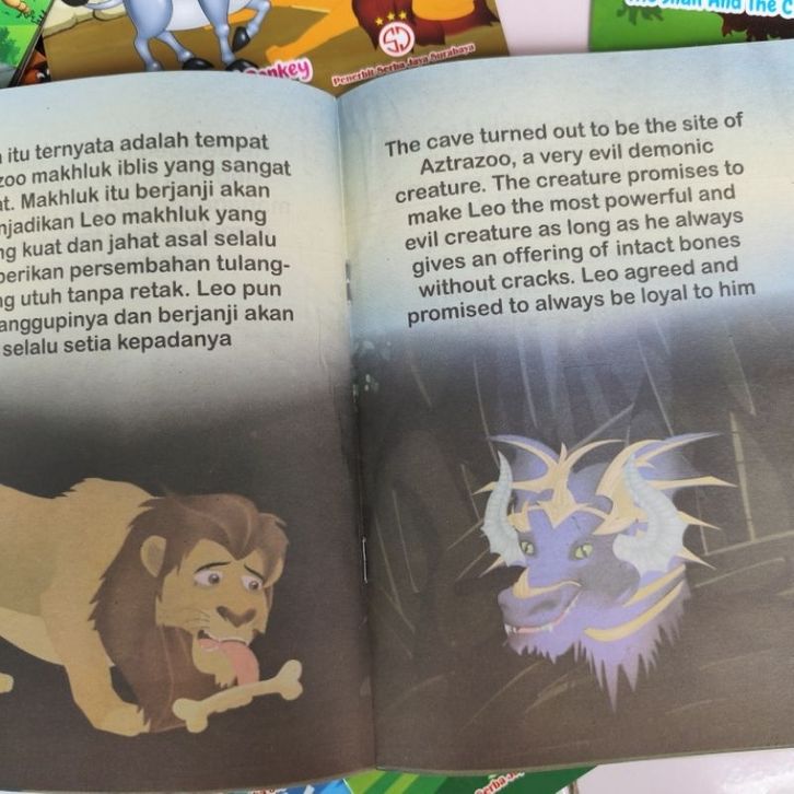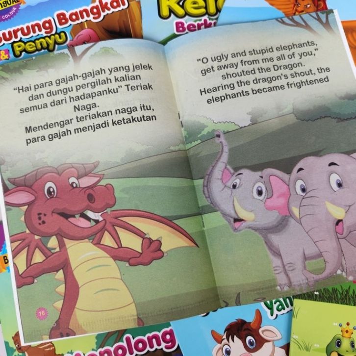 Anak Rusa, Anjing dan ayam, Ayam yg Tersihir, Bangau, Beruang, Burung Bangkai, Gagak, Gorilla, Ibu Sapi, Jerapah, Kancil dan harimau, Kancil dan serigala, Kancil raja rimba, Keledai, Kelomang, Kepiting, Kerbau, Kiwi, Kucing dan tikus, Kutilang dan kenari, Landak, Lebah dan semut, Merak, Nyamuk, Onta dan kasuari, Raja Katak, Rubah Biru, Sang Naga, Semut, Singa Bersayap, Siput, Tupai