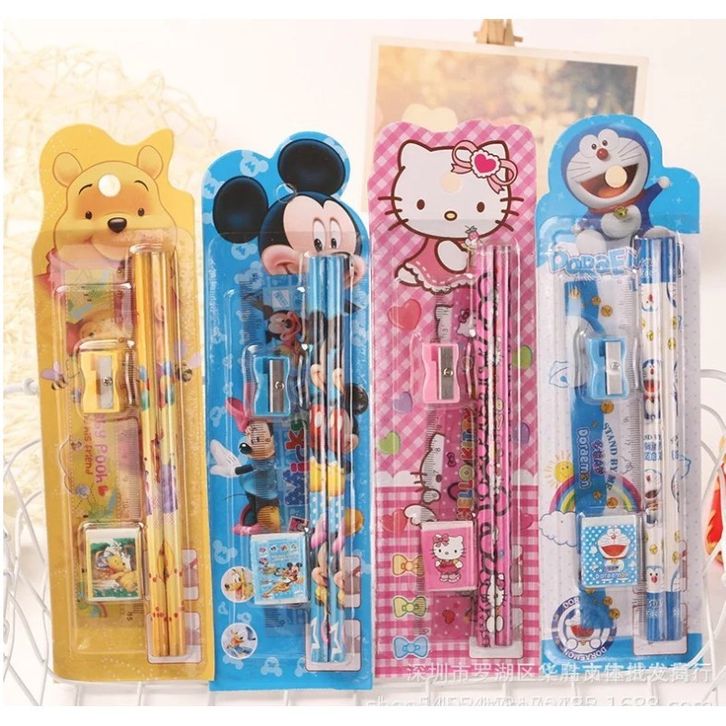 FLASHmall S004 MINI STATIONERY SET ALAT TULIS SEKOLAH 5 IN 1 KARAKTER LUCU