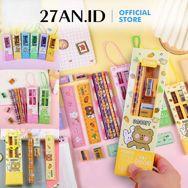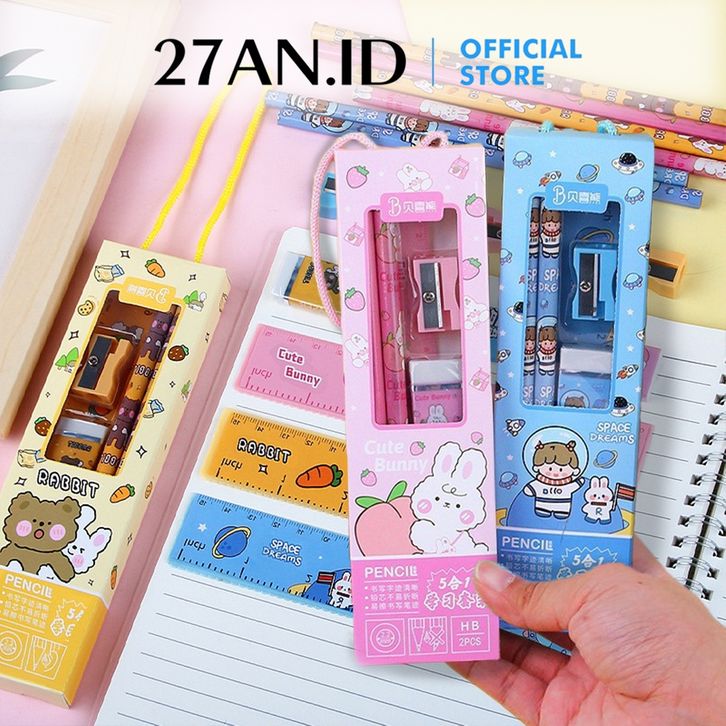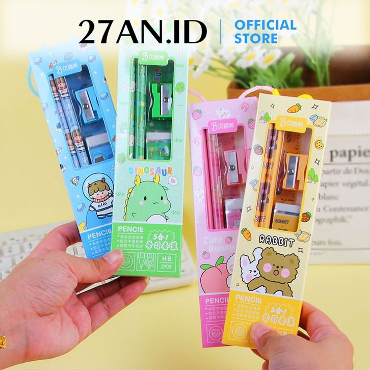 27AN.ID Set Alat Tulis Sekolah 5 IN 1 H641 Set Alat Tulis Motif Karakter Lucu Pensil Serutan