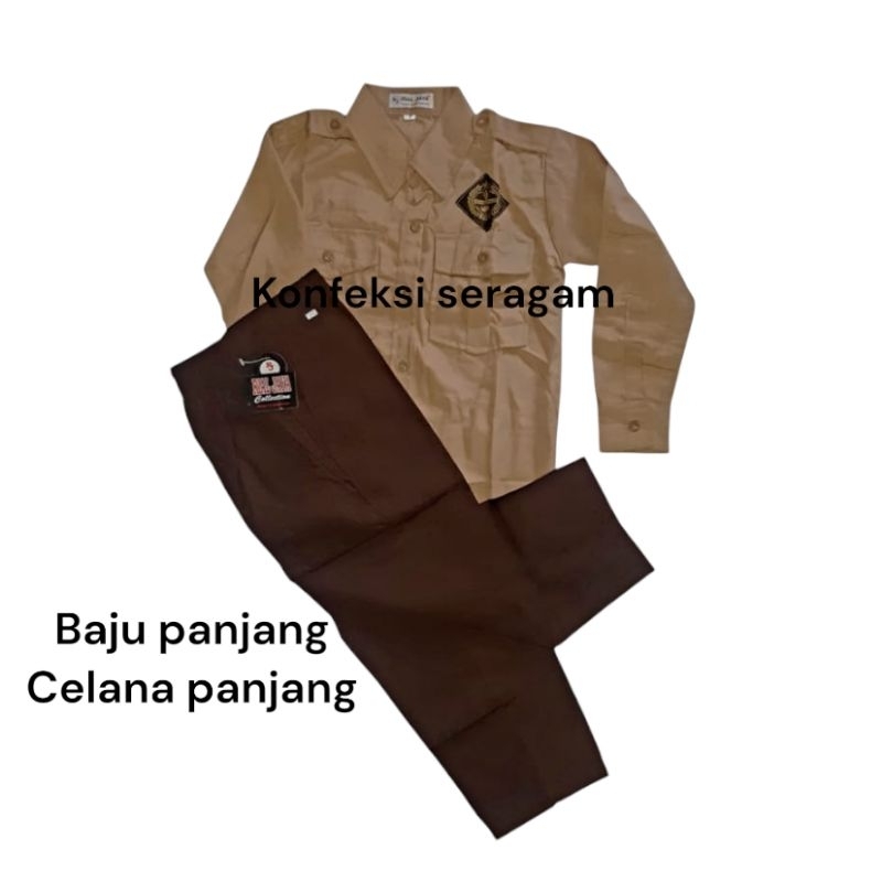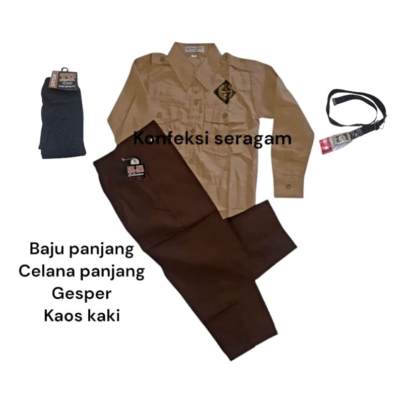 Seragam Sekolah Set Super Lengkap Pramuka Laki Laki Baju Panjang, Celana Panjang, Topi, Gesper, Dan Kaos Kaki