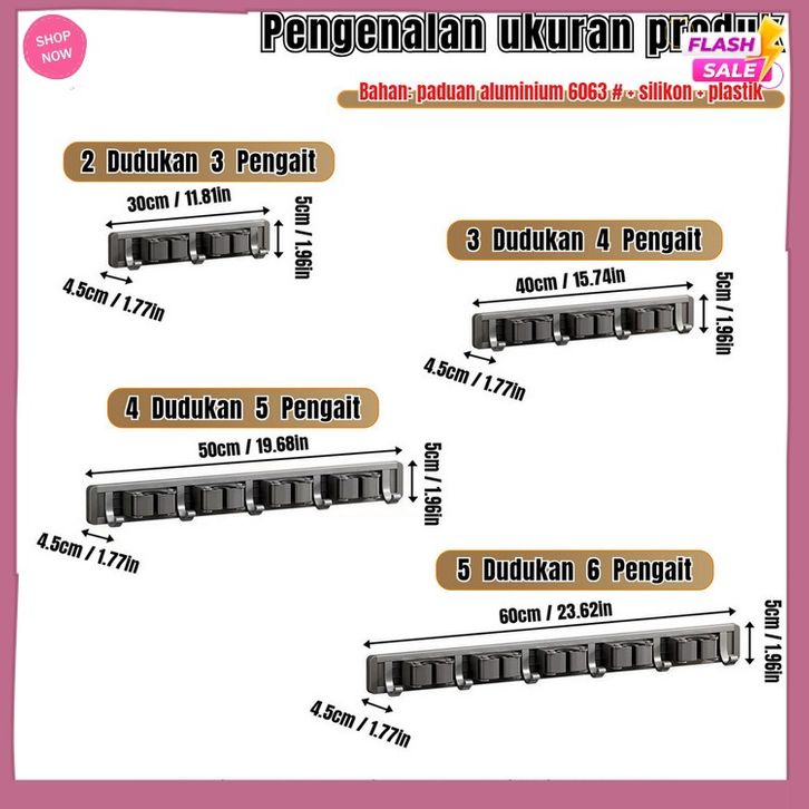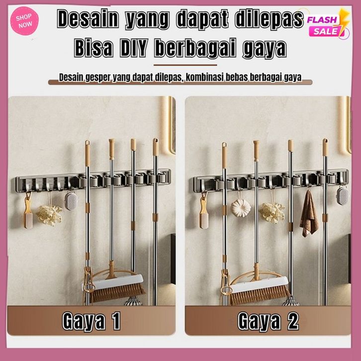 Gantungan Sapu Alat Pel Penjepit Gantungan Dinding Mop Holder Tempel Paduan Aluminium Dengan Hook Multifungsi