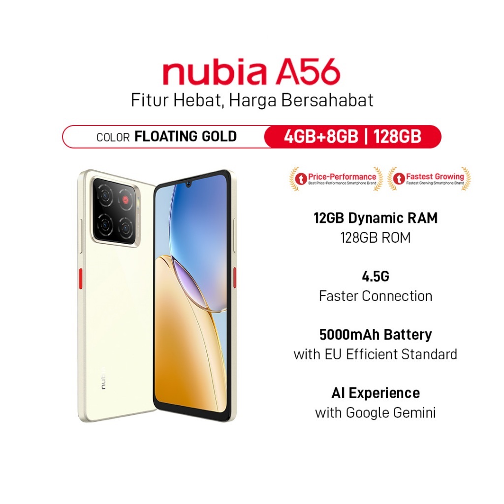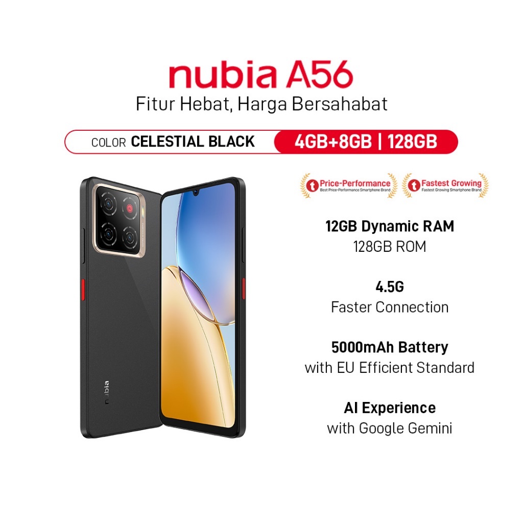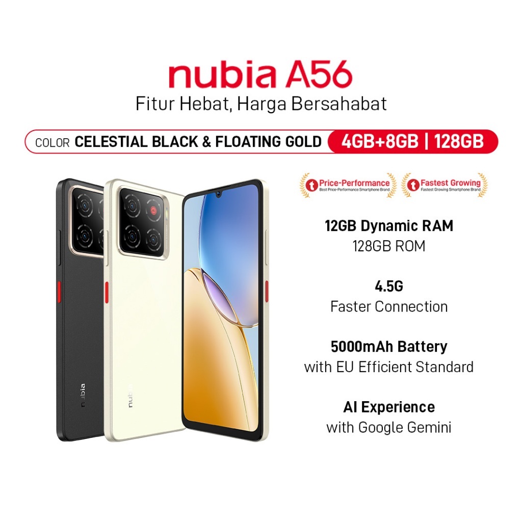 [Mall] Handphone Nubia A56 ROM 128GB RAM 12GB (4+8GB) Smartphone Kamera AI 13MP Triple Camera Layar 6.75" 90Hz, Baterai