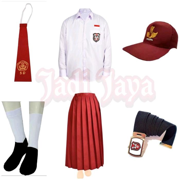TERLARIS SET SERAGAMMERAH PUTIH SD PEREMPUAN PANJANGSATU SET + TOPI MERAH POLOS, 6 THN