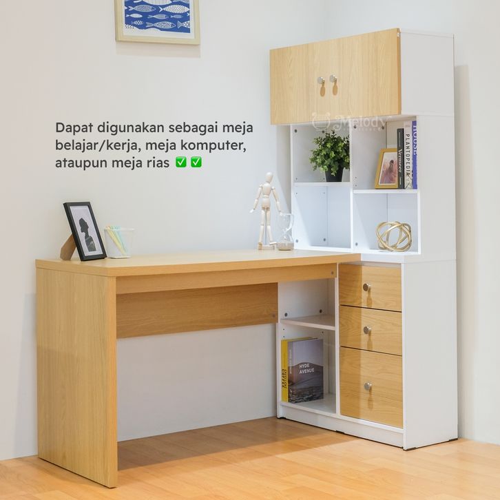 Melody Furniture - Meja Belajar Kantor Kerja Huko Desk Dengan Rak Buku - Bianco White