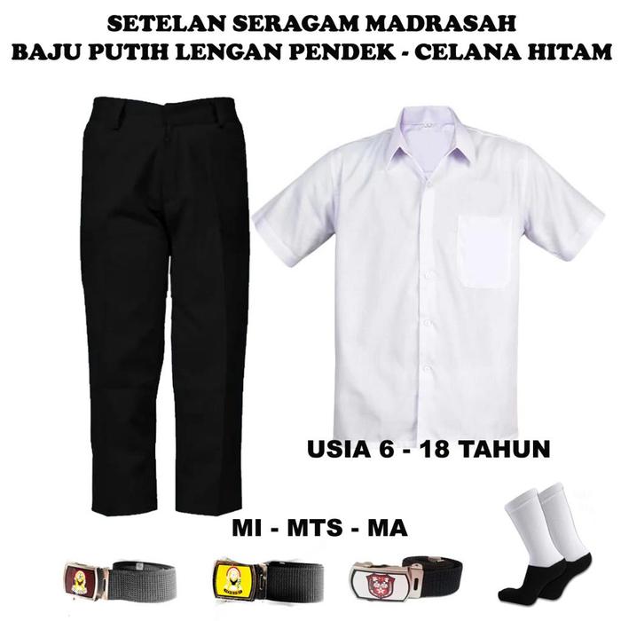 TERLARIS SETELAN SERAGAM SEKOLAH MADRASAH MIMTSMA BAJU PUTIH LENGAN PENDEK DAN CELANA PANJANG HITAM USIA 618 TA