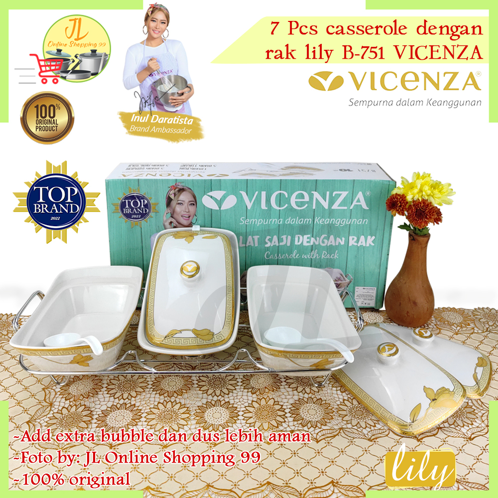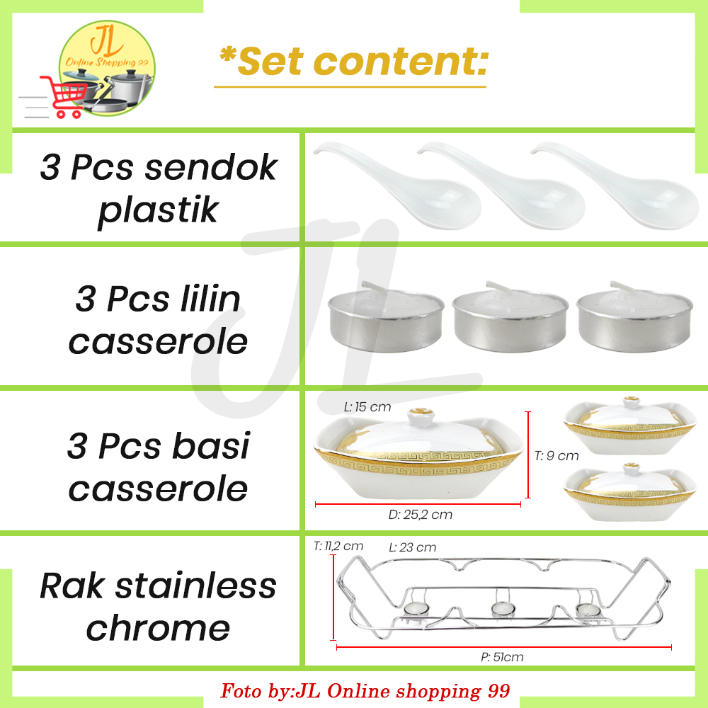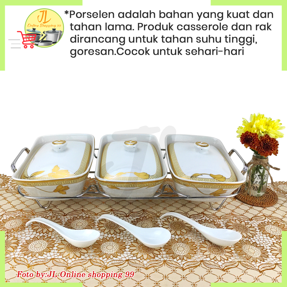 VICENZA wadah saji set isi 3 motif Lily + rak B-751 / pemanas makanan / casserole food warmer keramik