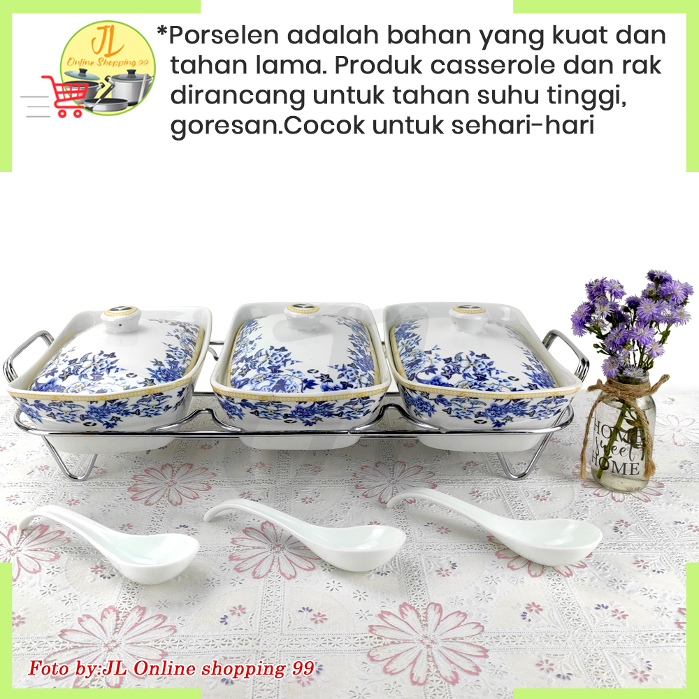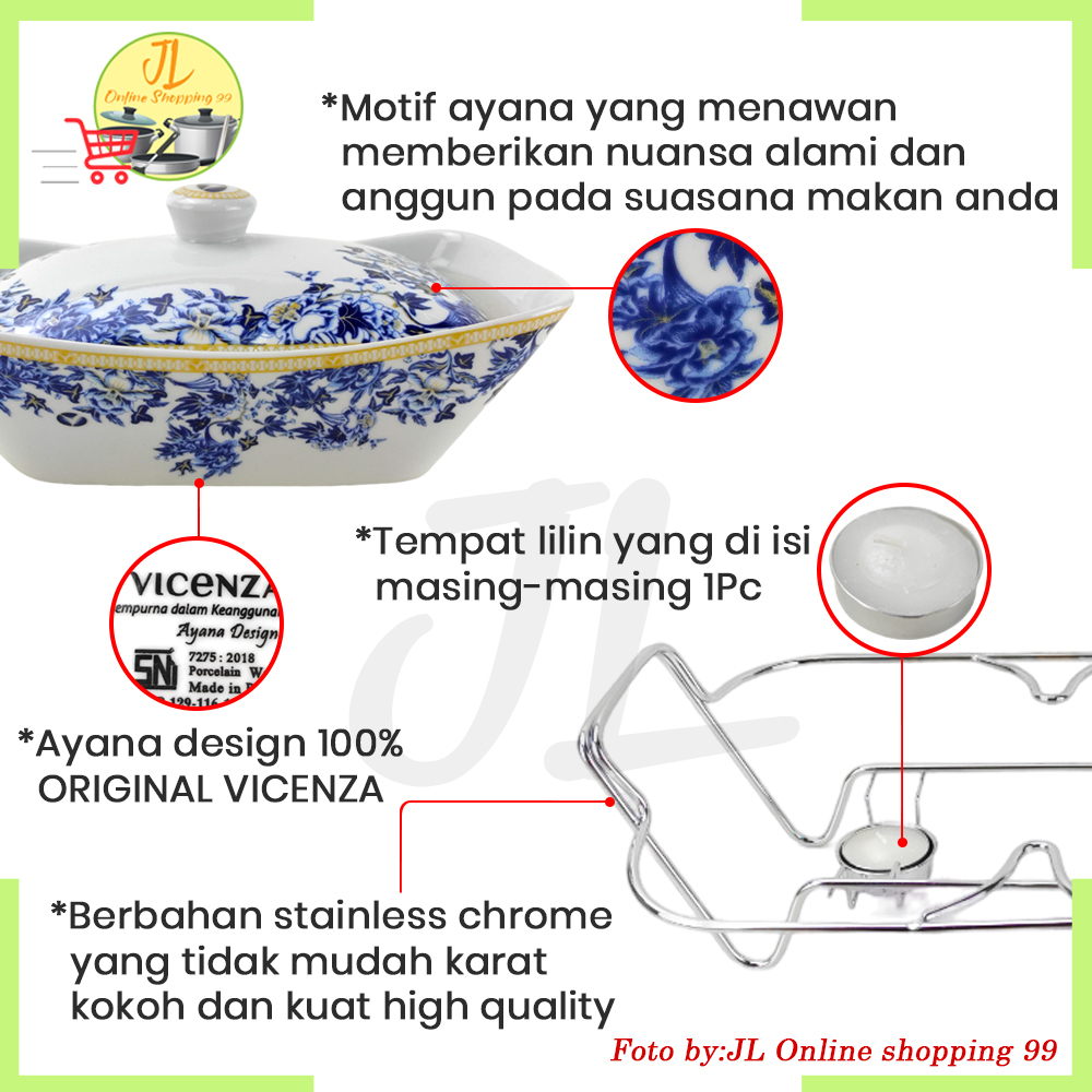 VICENZA wadah saji set isi 3 motif Ayana + rak BA-751 / pemanas makanan / casserole food warmer keramik