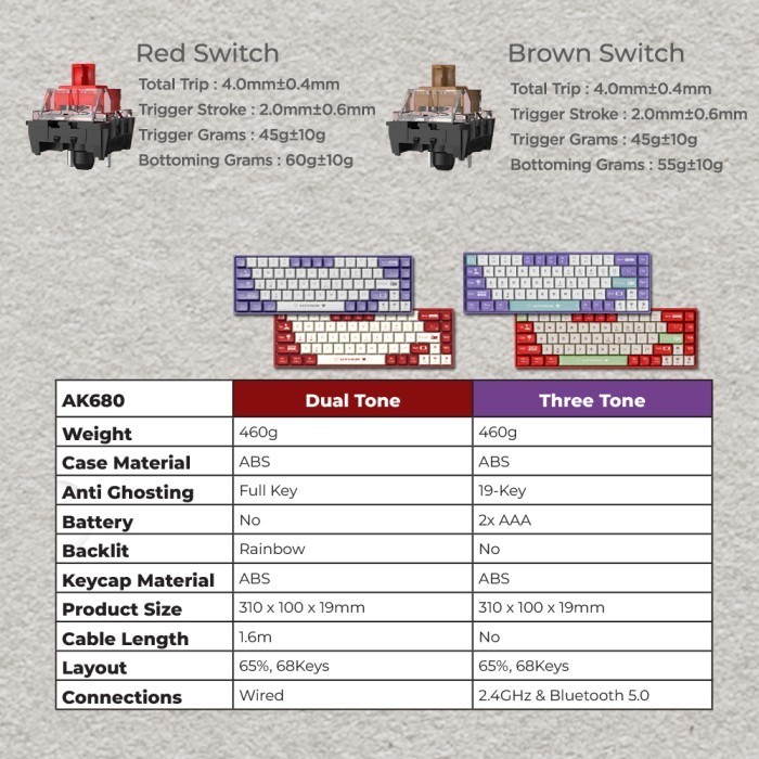 Ajazz AK680 Three Tone 65 PERSEN Mechanical Keyboard Dual Mode No Light
