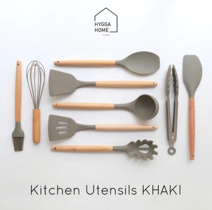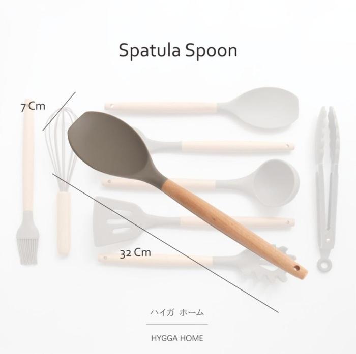 Promo KHAKI Silikon Sutil Pencapit Spatula Kuas Sendok Gagang Kayu / Kitchen Utensil Kitchenware - Food Clip Keren
