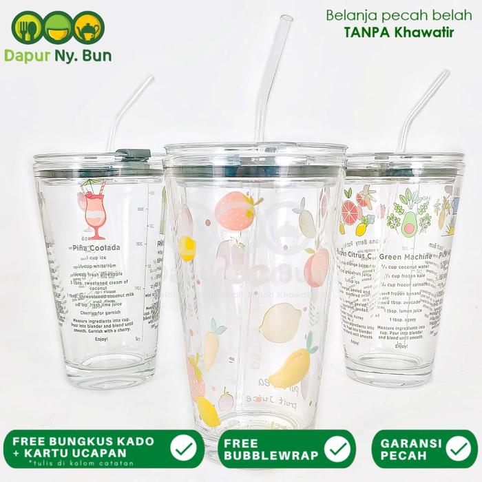 Promo 1 Pc Premium Gelas Kaca Borosilikat + Tutup + FREE Sedotan Ukuran 450ml - Gelas kaca Keren