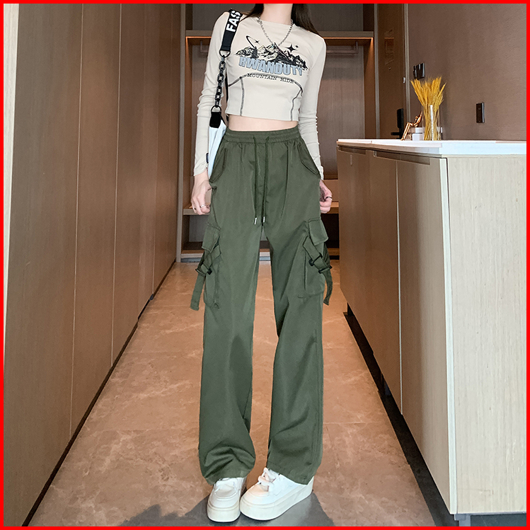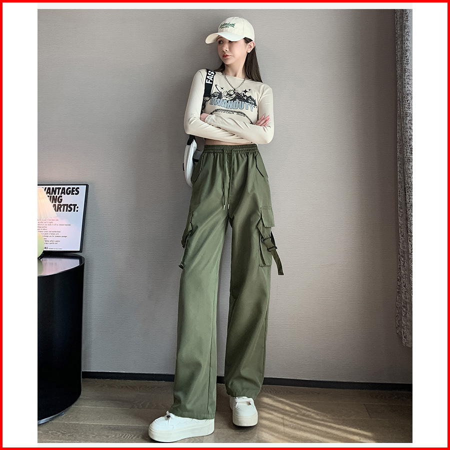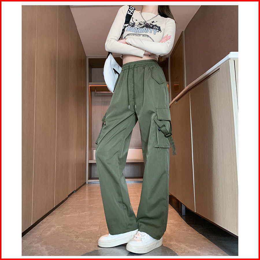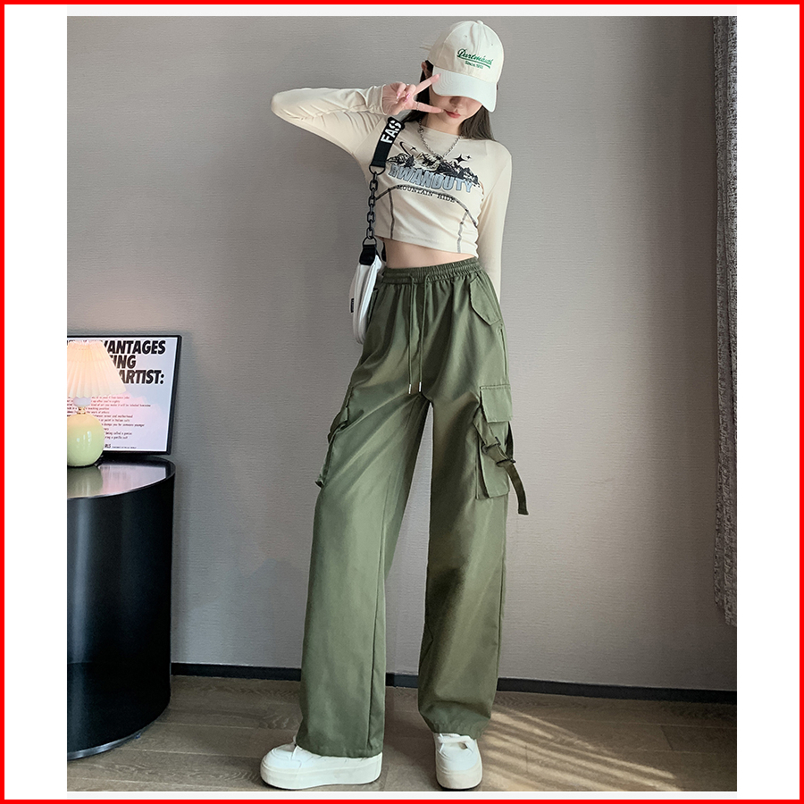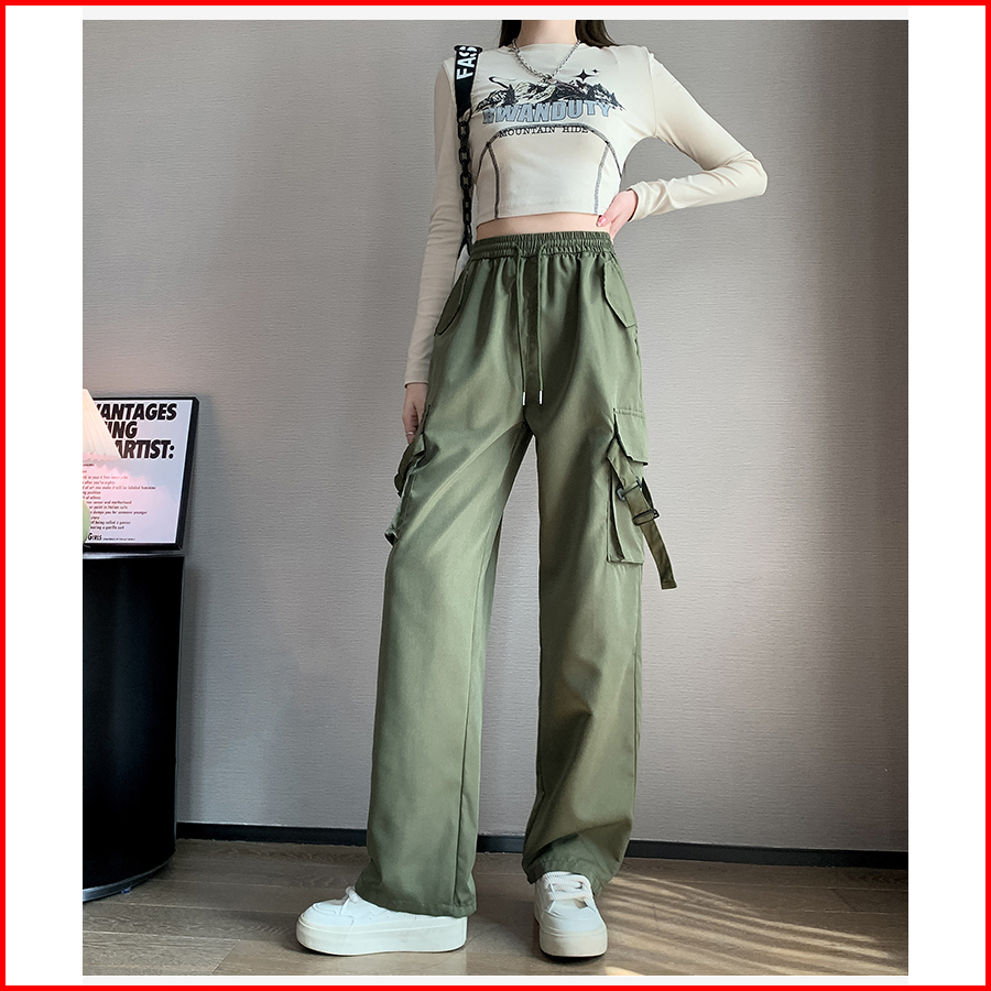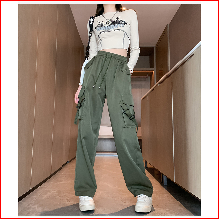 Hijau Pink Hitam Highwaist Kasual Celana Cargo Wanita Loose