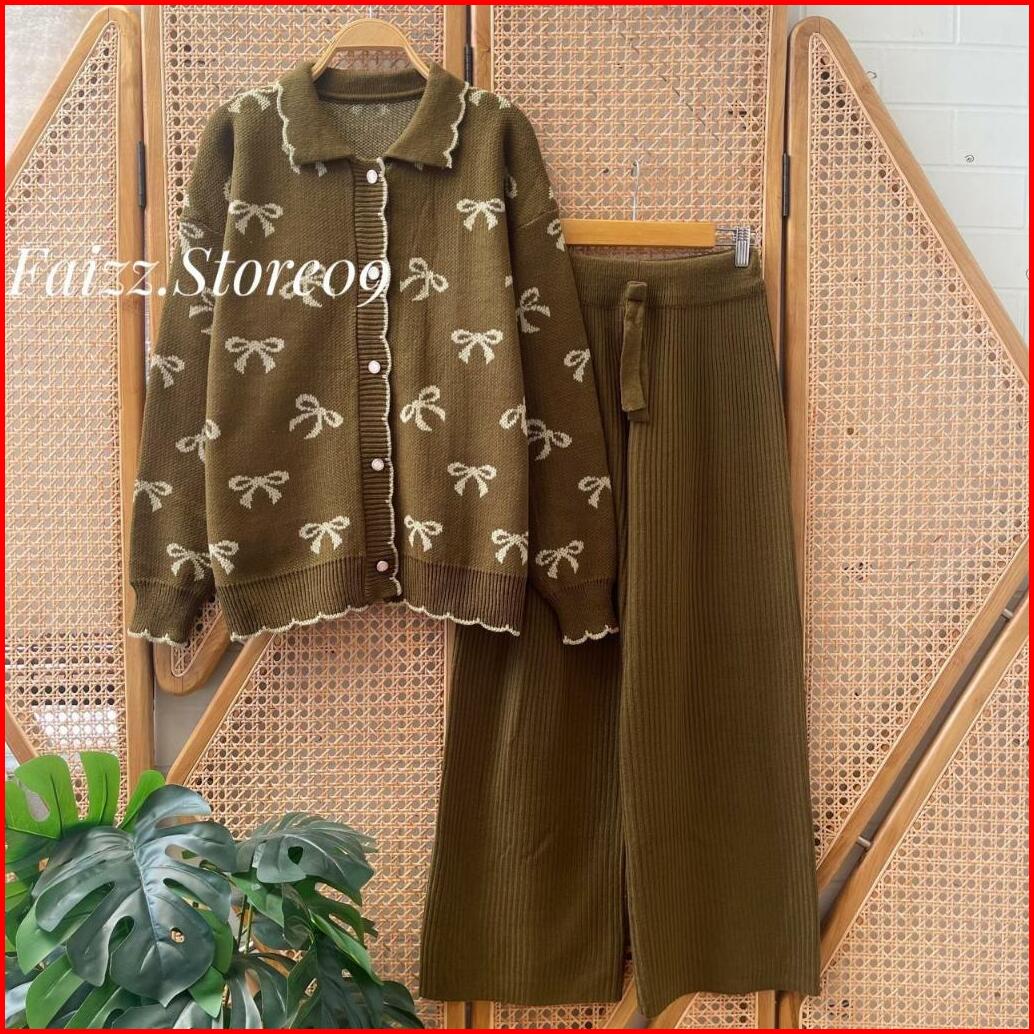 Oneset Poppy Cardigan Rajut Berkerah Motif Pita Setelan Celana Kulot Premium Wanita Lengan Panjang Kekinian