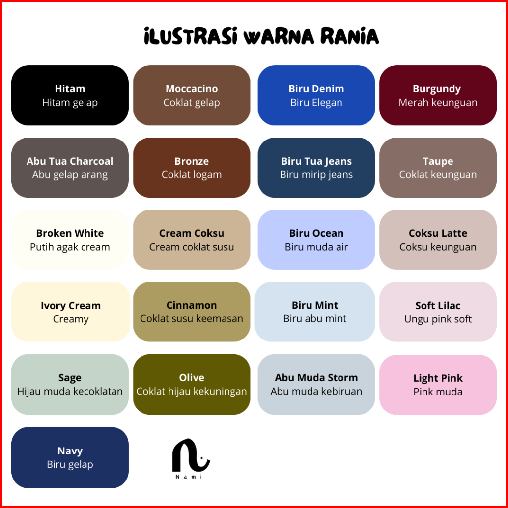 Hitam, Sage matcha, Cream, Broken White, Light Pink, Navy, Ivory, Coksu Latte, Hijau, ZR-Hijau, Biru tua jeans, Abu Muda Storm, Taupe, Burgundy, Denim Blue, Moccacino, Olive Brown, Soft Lilac, Bronze, Abu Charcoal, Abu Biru Mint, Cinnamon, Biru Ocean