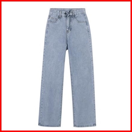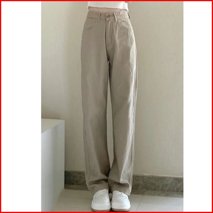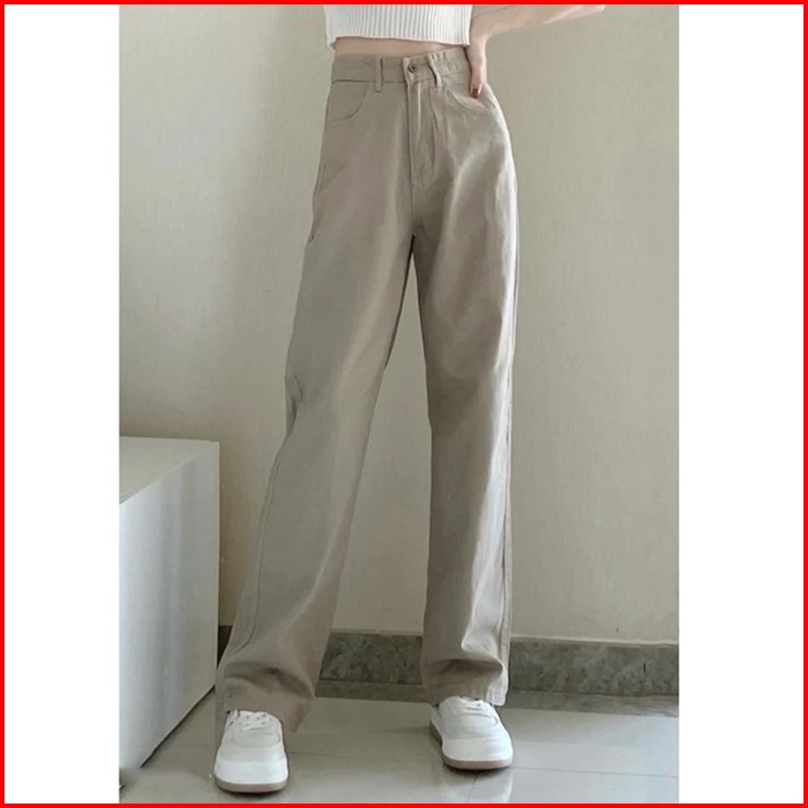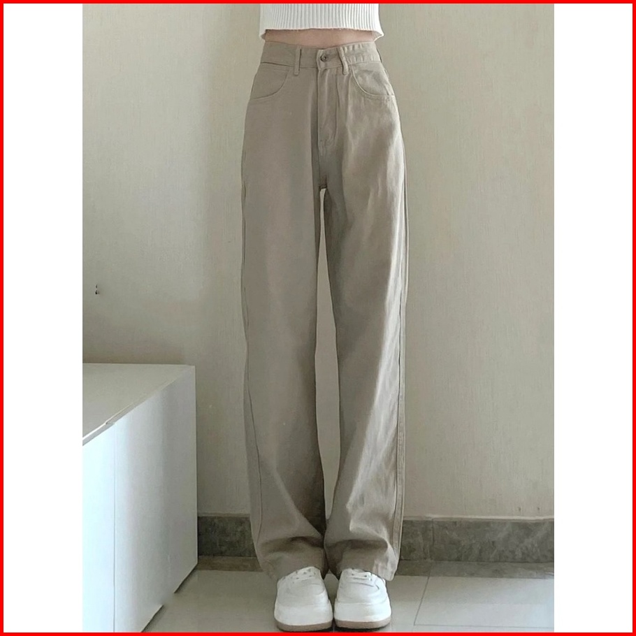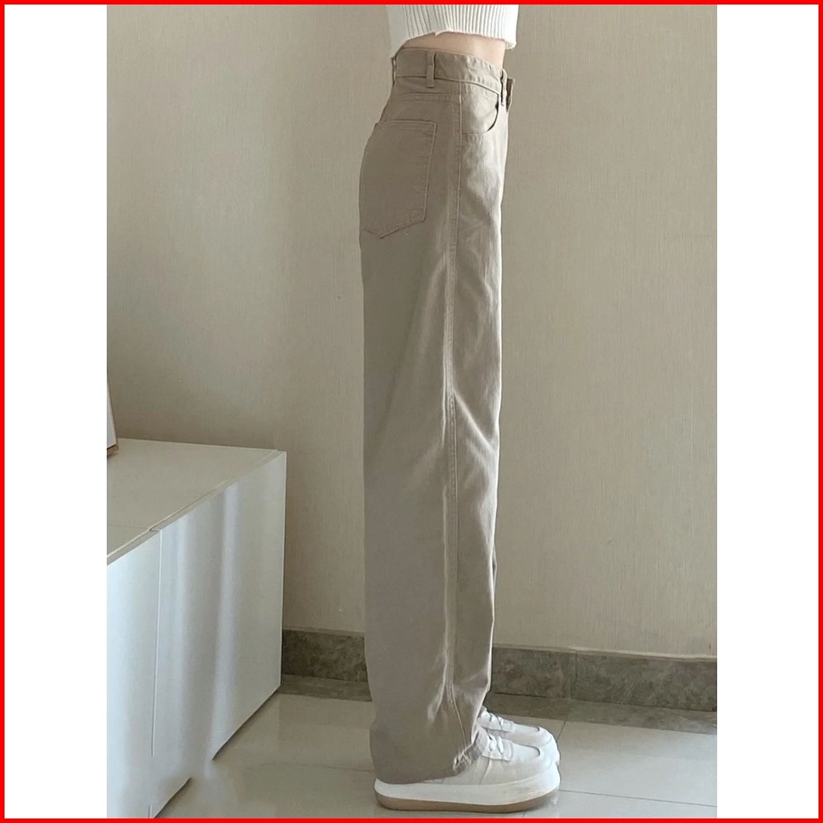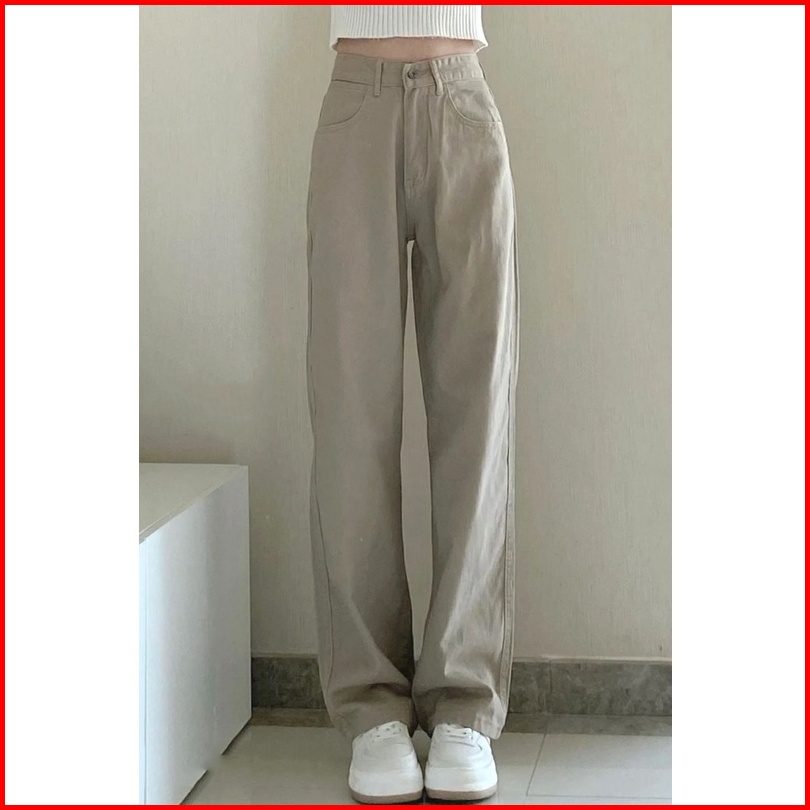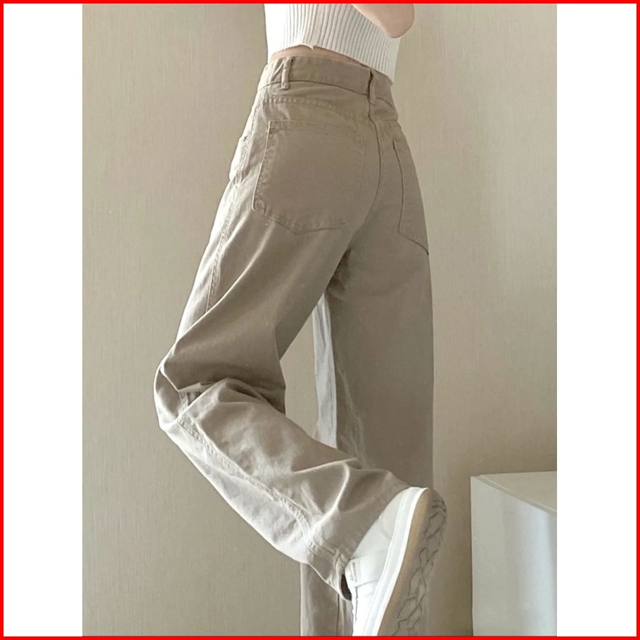 Celana Jeans Longgar Wanita Pinggang Tinggi Khaki Muda Korea Baru