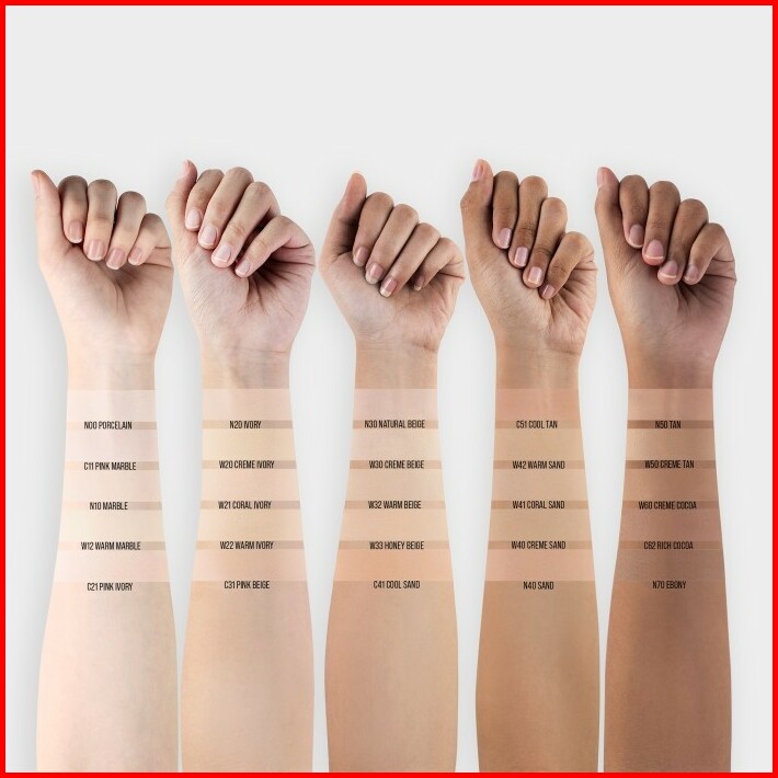 C11 Pink marble, C21 PinkIvori, C31 Pink Beige, C41 Cool Sand, C51 Cool Tan, C62 Rich Cocoa, N00 Porcelain, N10 Marble, N20 Ivory, N30 Nat Beige, N40 Sand, N50 Tan, N70 Ebony, W12 Warm Marble, W20 Creme Ivory, W21 Coral Ivory, W22 Warm Ivory, W30 Creme Beige, W32 Warm Beige, W33 Honey Beige, W40 Creme Sand, W41 Coral San, W42 Warm Sand, W50 Creme Tan, W60 Creme Cocoa