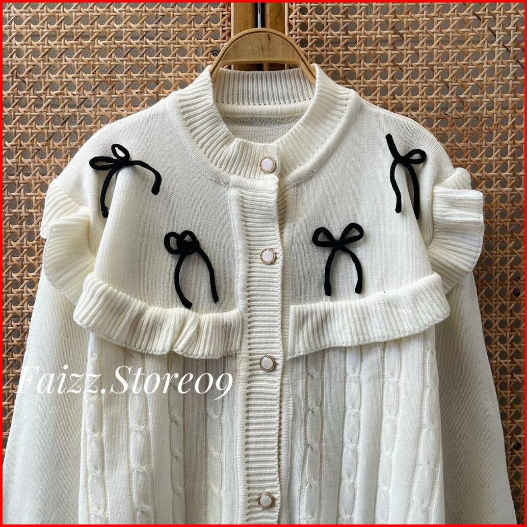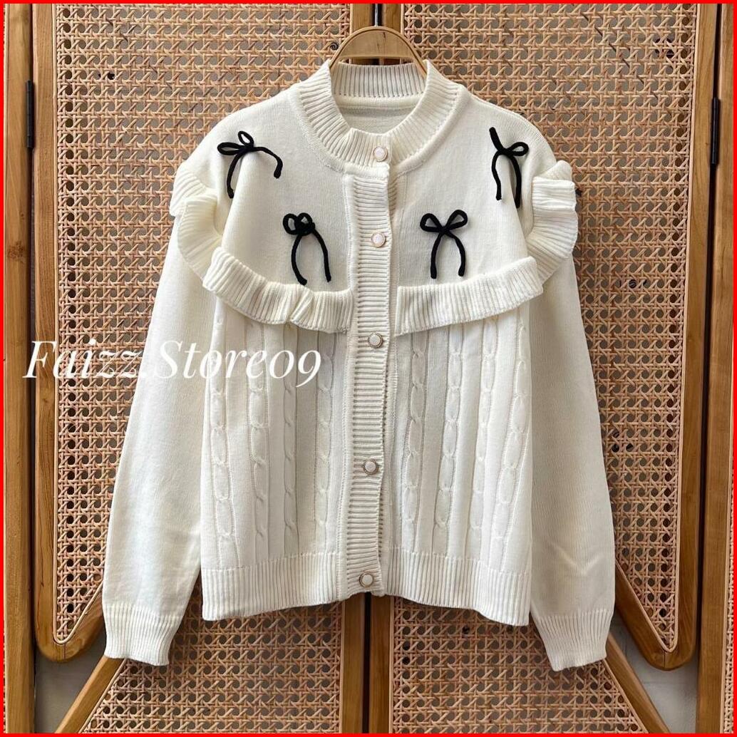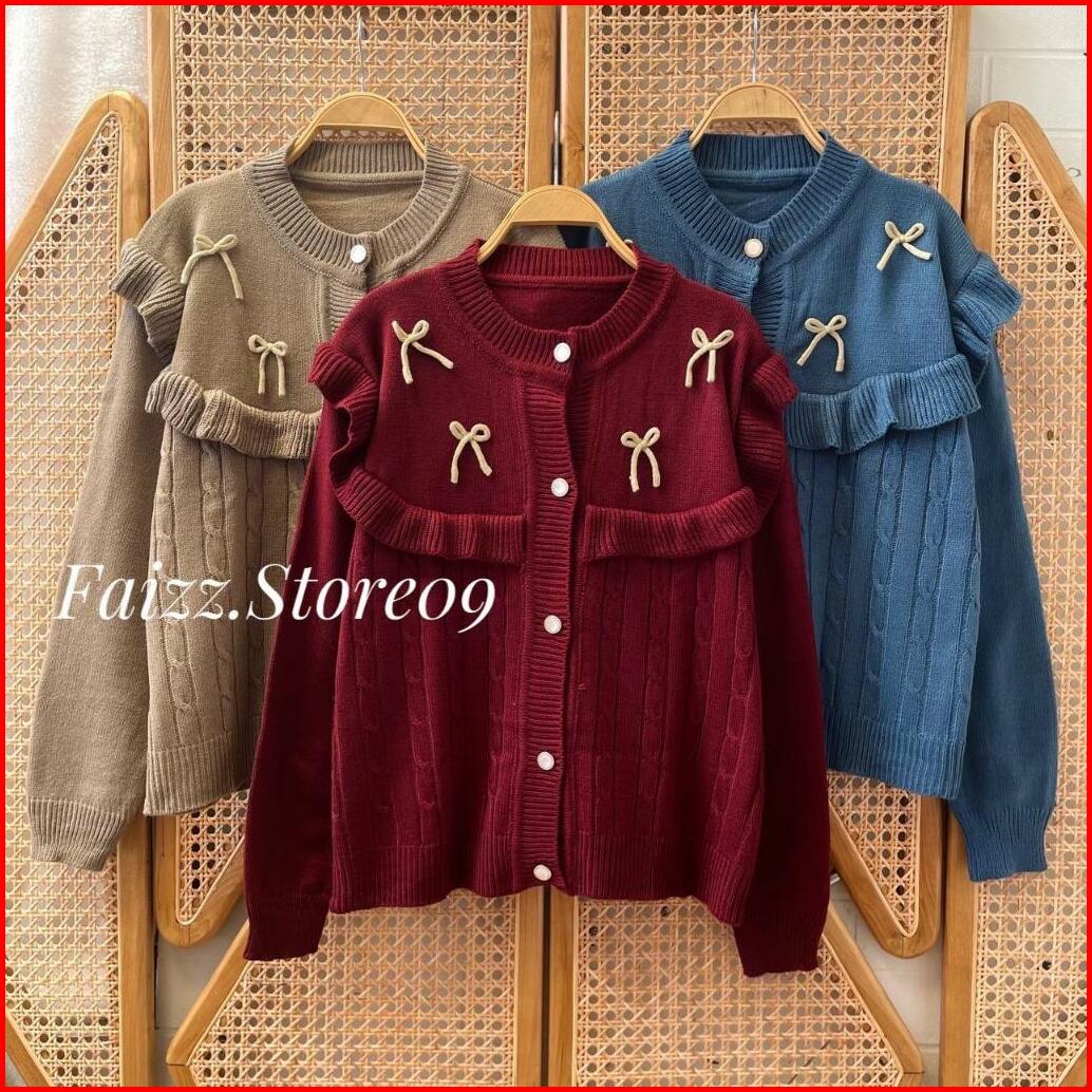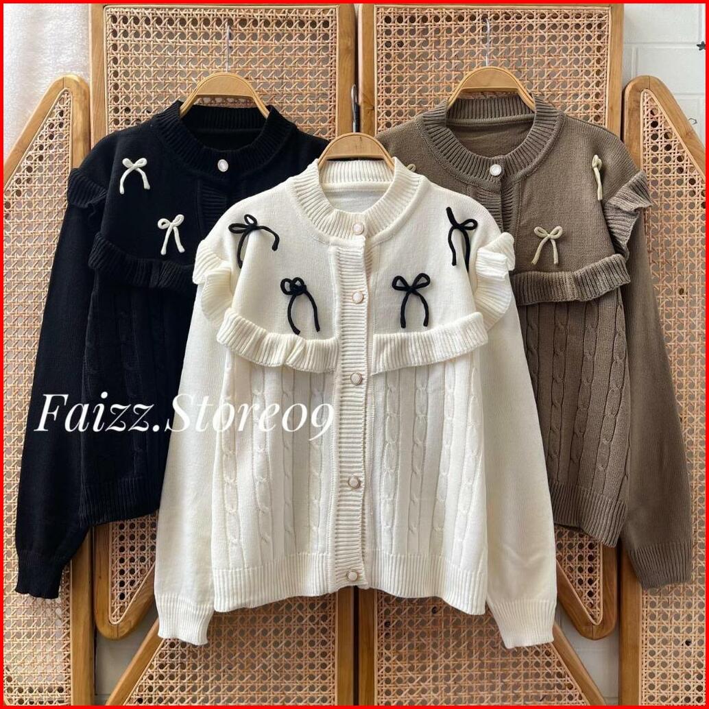Dina Knits - Atasan Cardigan Rajut Kancing Wanita Motif Cable Pita Renda Kekinian Korean Style Premium