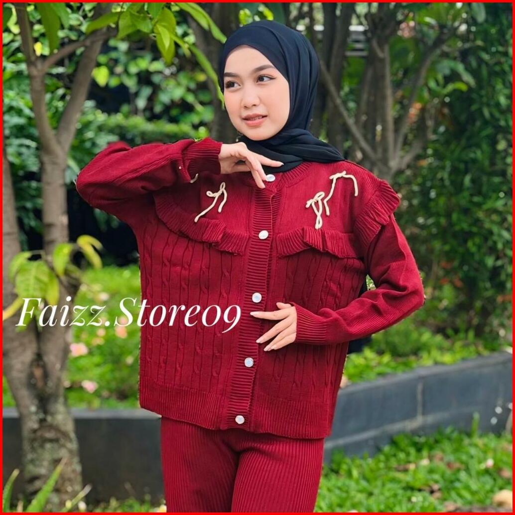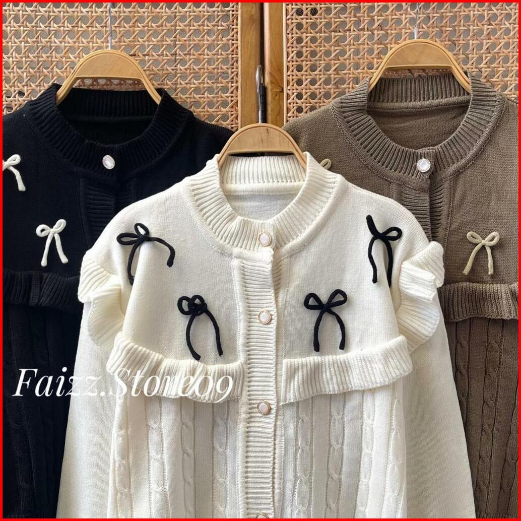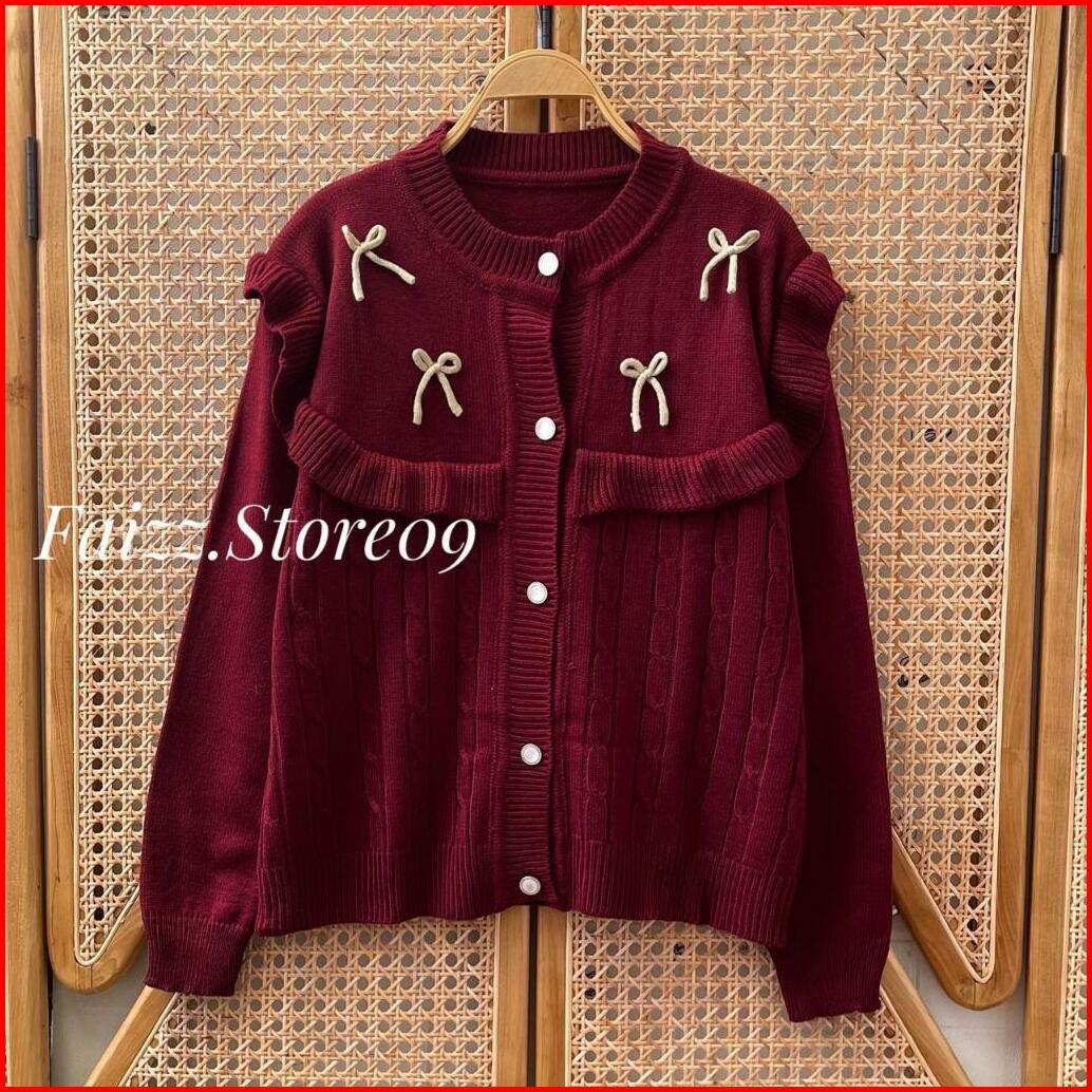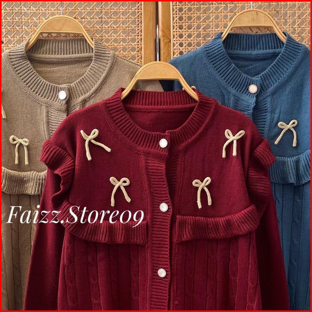 Dina Knits - Atasan Cardigan Rajut Kancing Wanita Motif Cable Pita Renda Kekinian Korean Style Premium