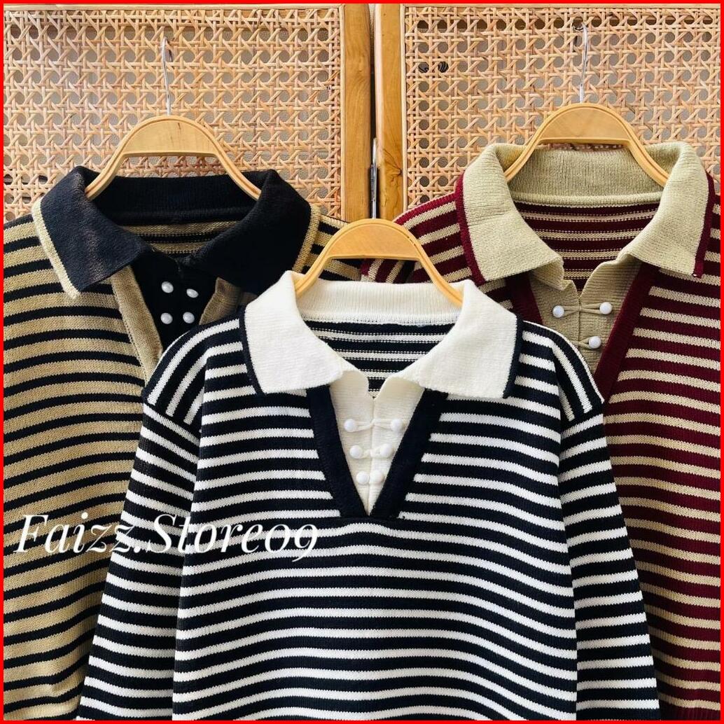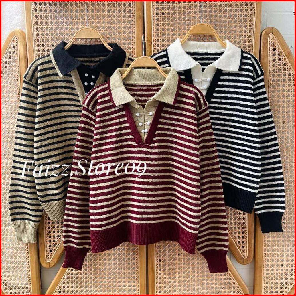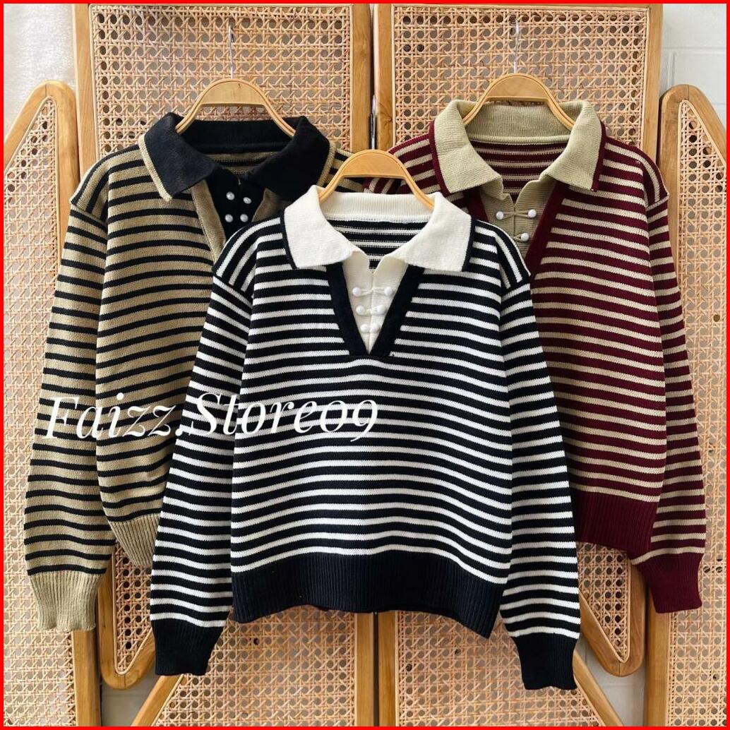 Paula Knits - Atasan Sweater Rajut Wanita Berkerah Polo Motif Stripe Kekinian Korean Style Premium