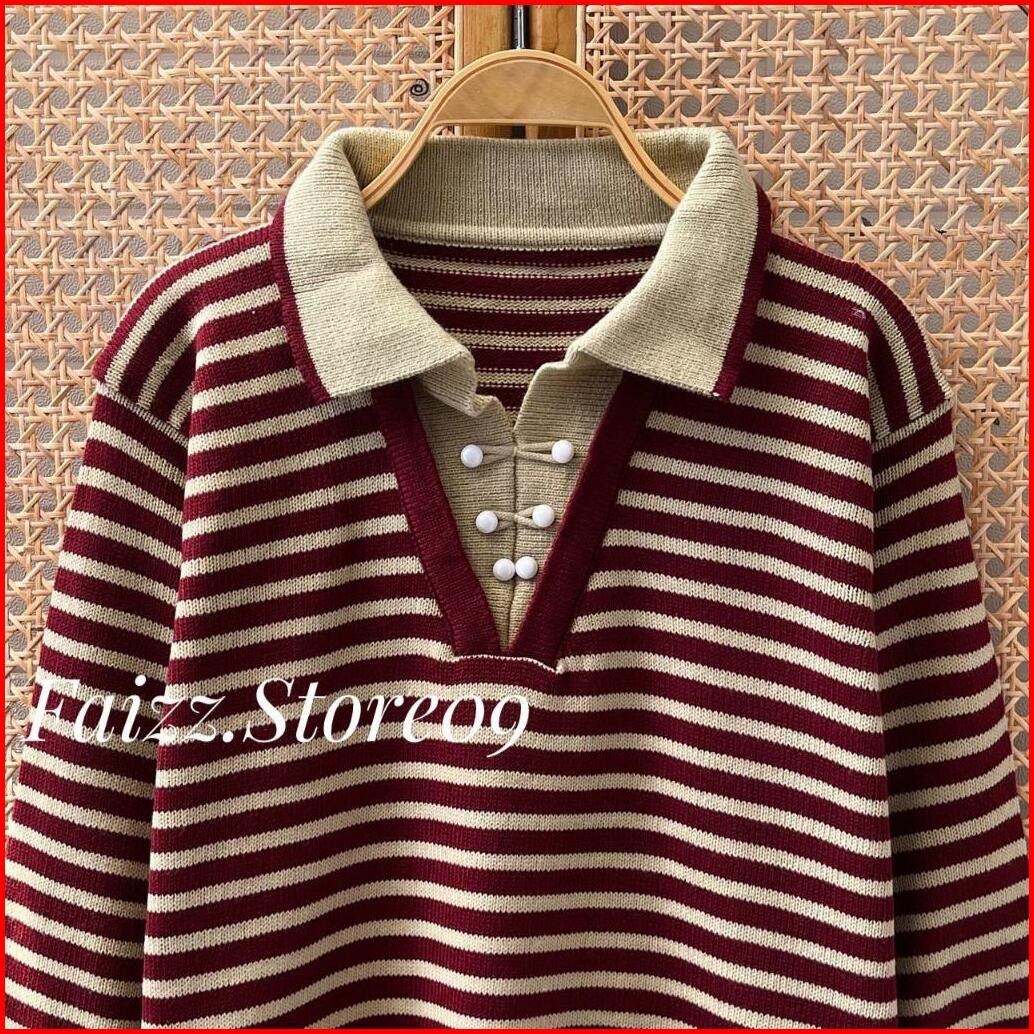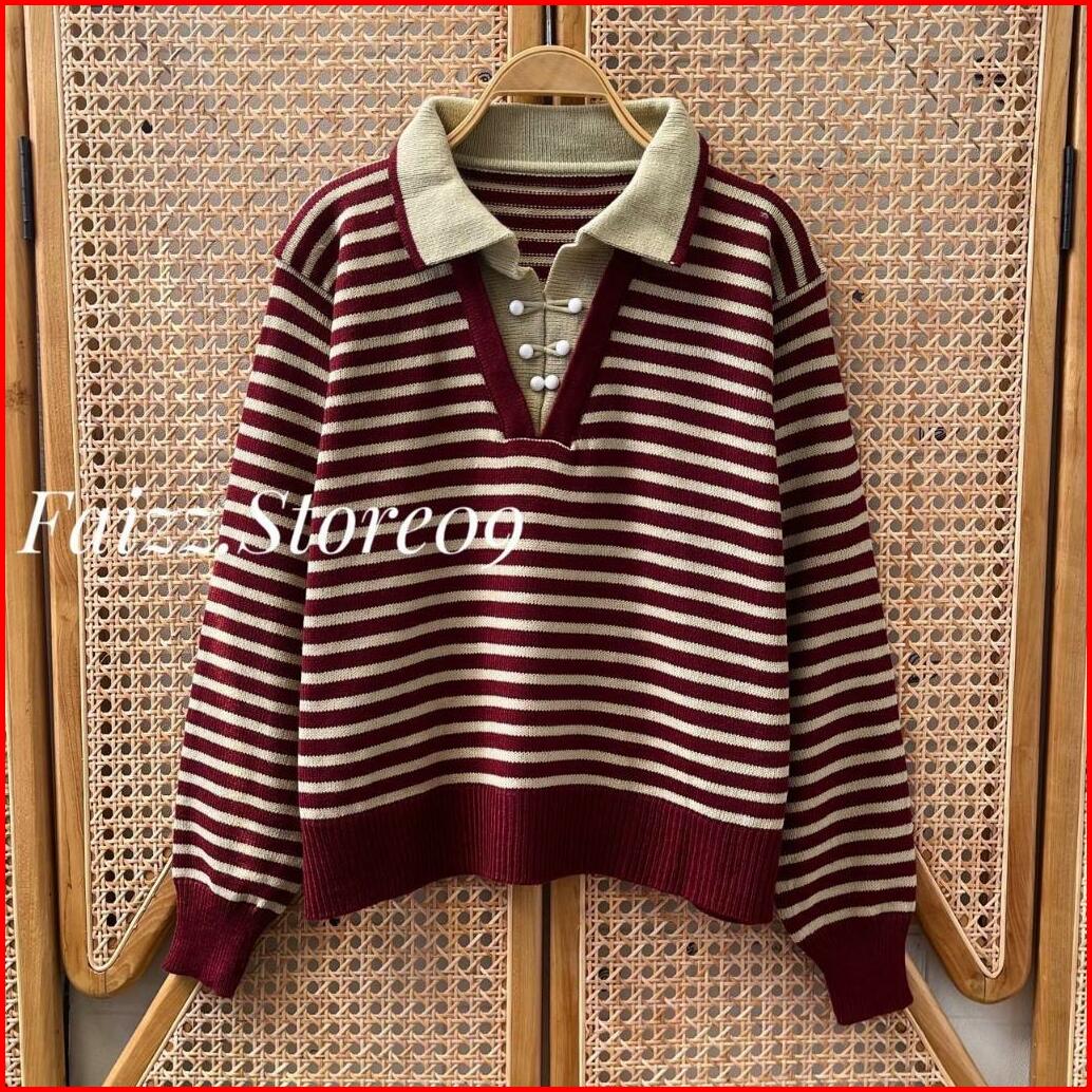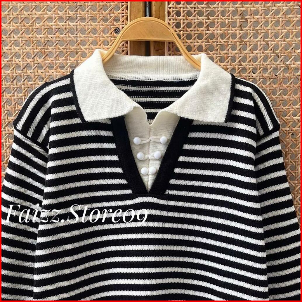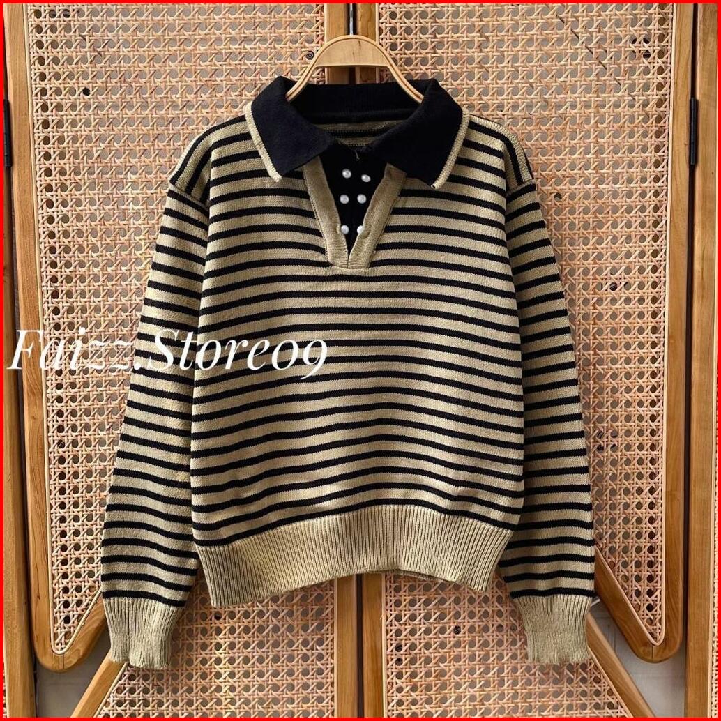 Paula Knits - Atasan Sweater Rajut Wanita Berkerah Polo Motif Stripe Kekinian Korean Style Premium