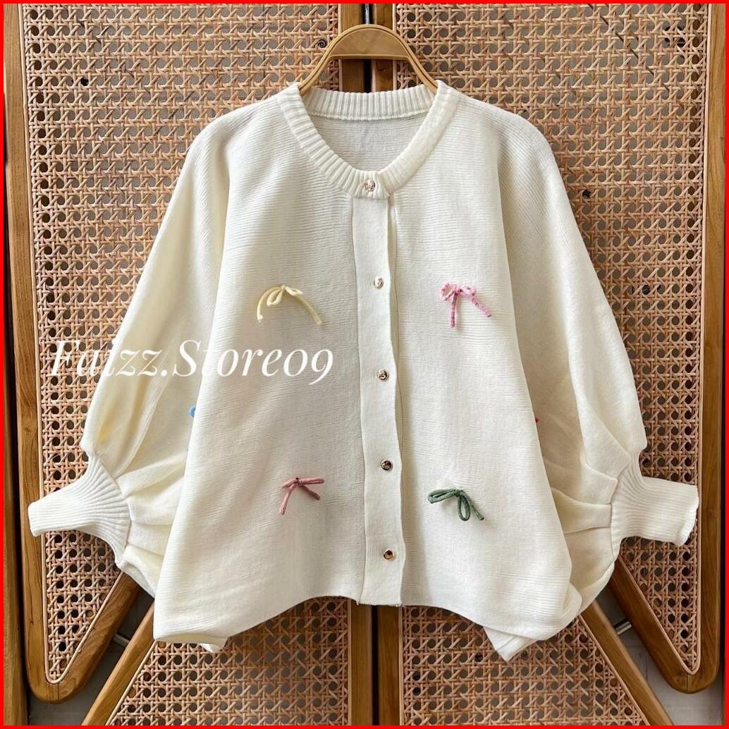 Hillary Atasan Knitwear Lucu - Cardigan Rajut Kancing Oversize Batwing Wanita Motif Pita Lengan Kalong Kekinian Korean S