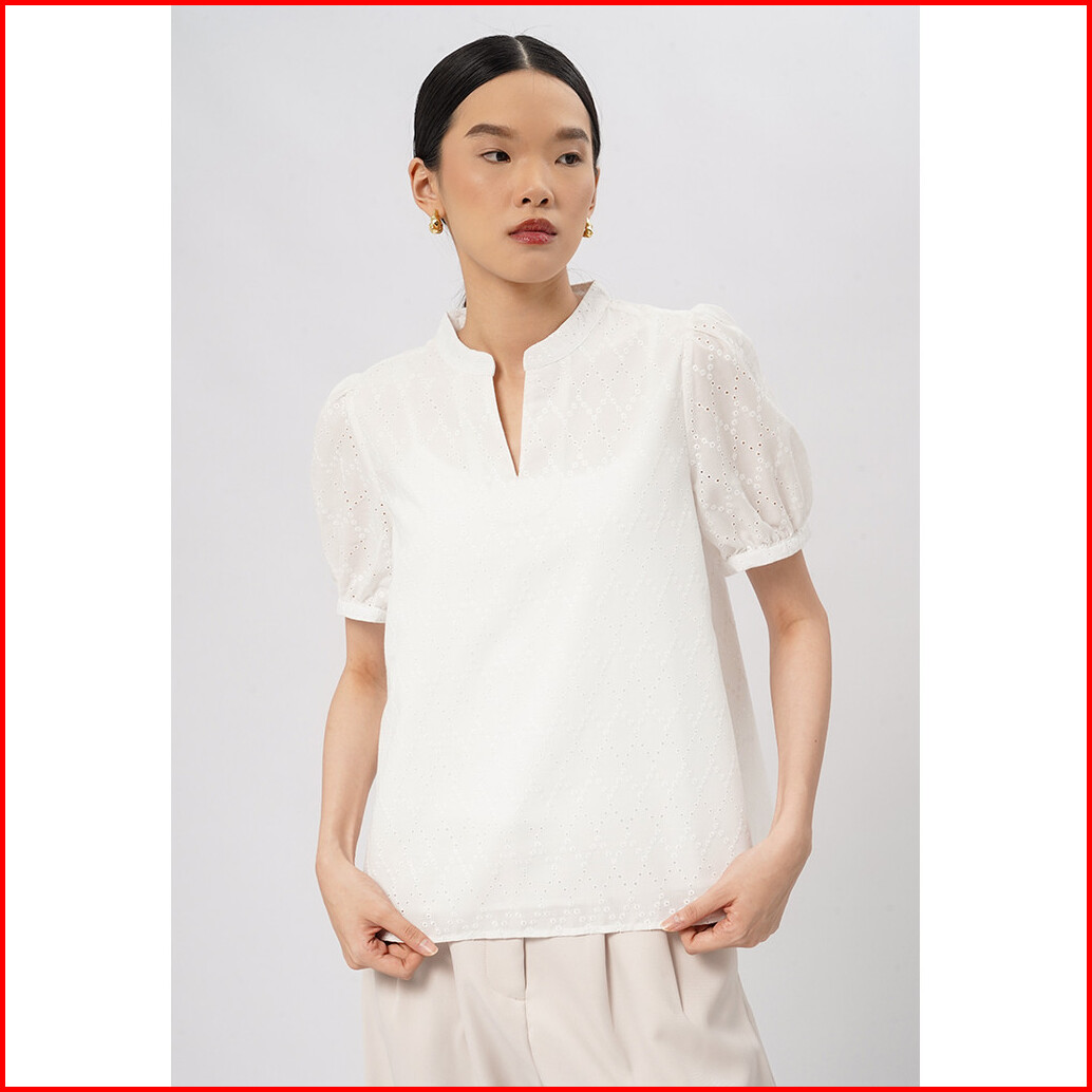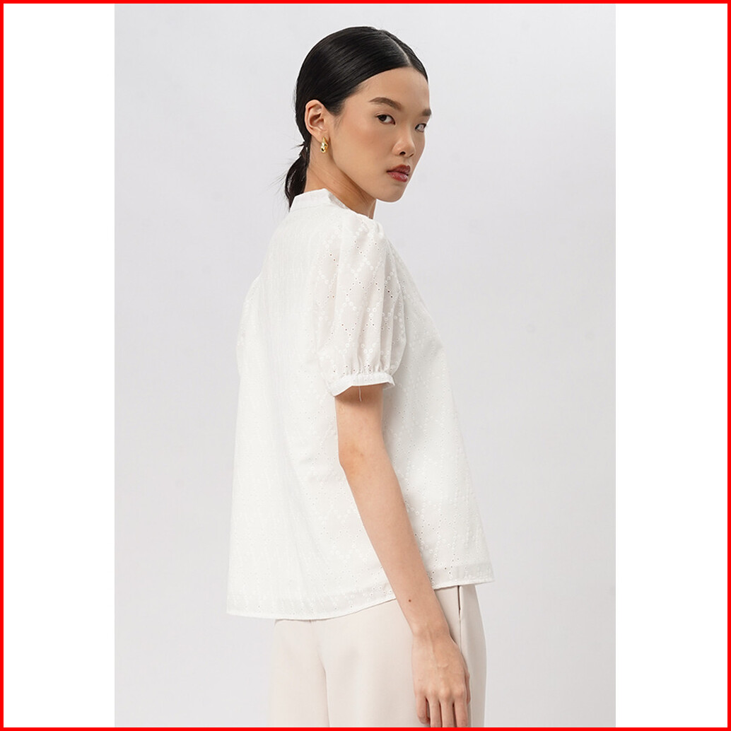 Executive Short Sleeves V-neck Eyelet Blouse Off White