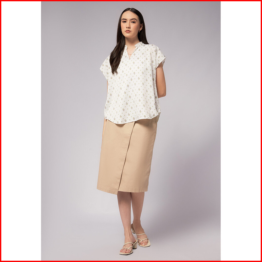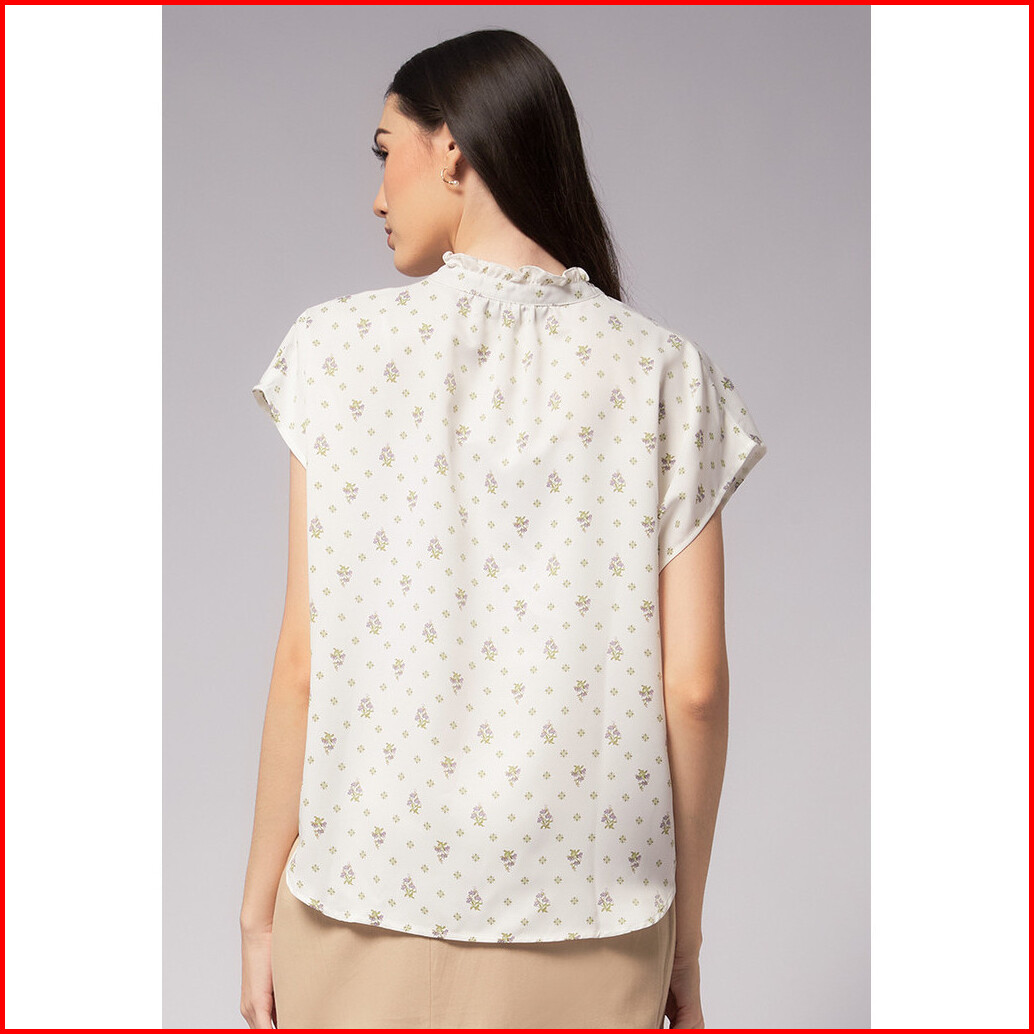 Executive Printed Crinkle Ruffle Neck Blouse Ecru