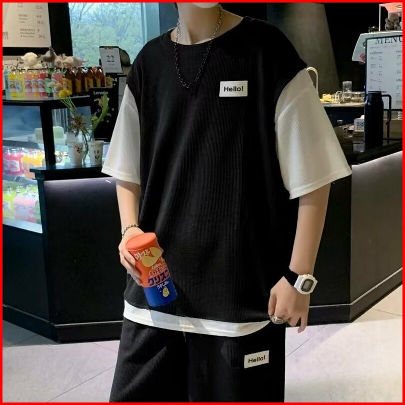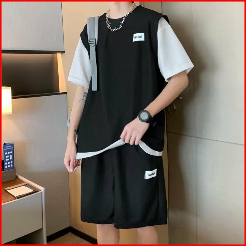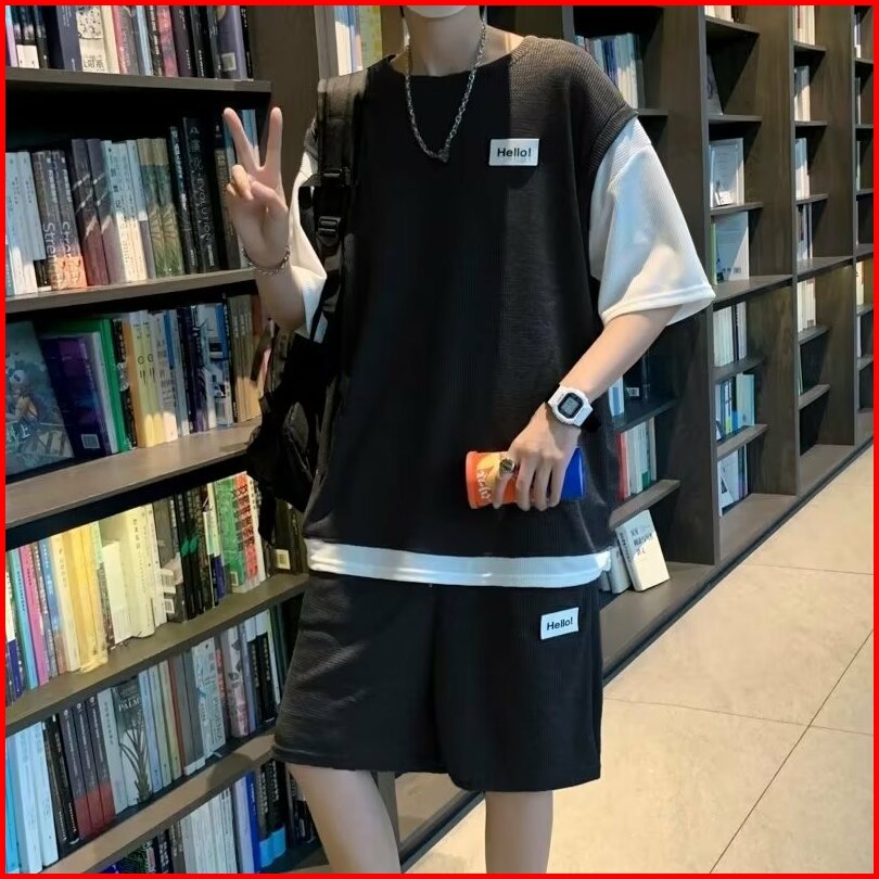 Big Sale Setelan Kaos Pria Korean Style 2025 Set Baju Kaos Oversize Pendek Pria Modis Dengan Pendek Pria Hitam Putih Dan
