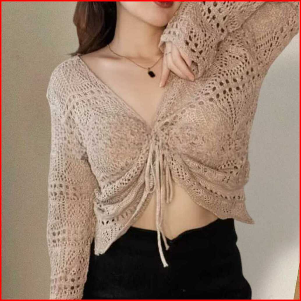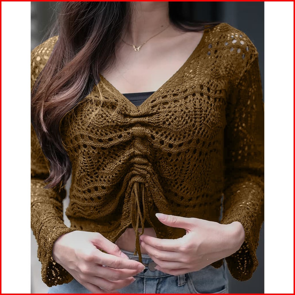 Blouse Style Korea Zolla Knit Top Crop Premium Acrylic - Rajutan Berongga Longsleeve Tali Serut Jaring