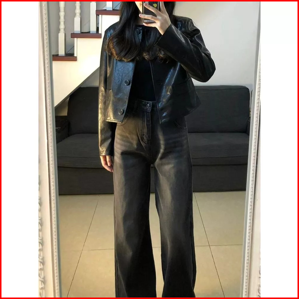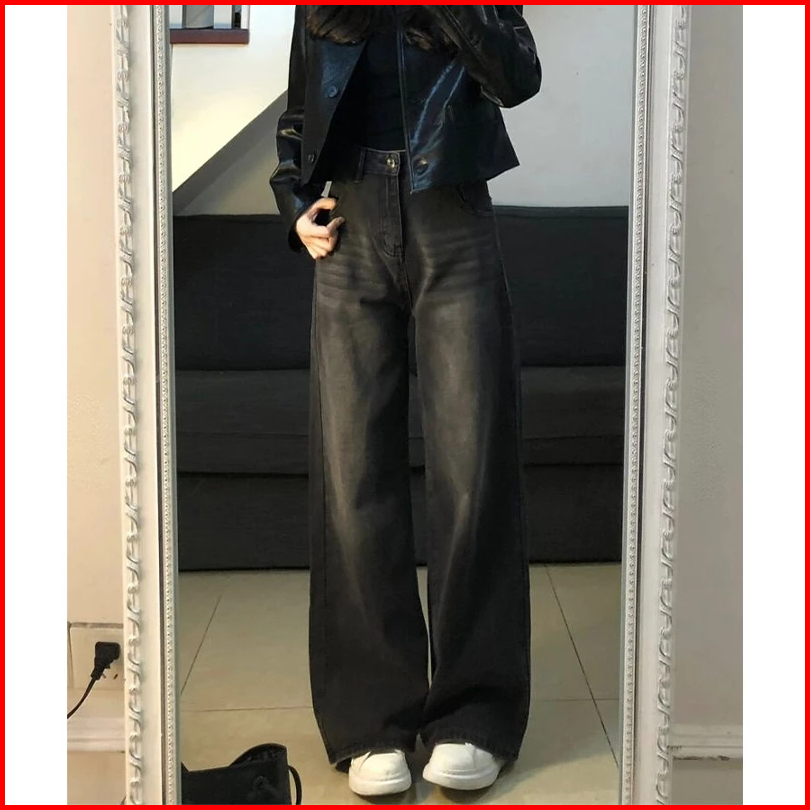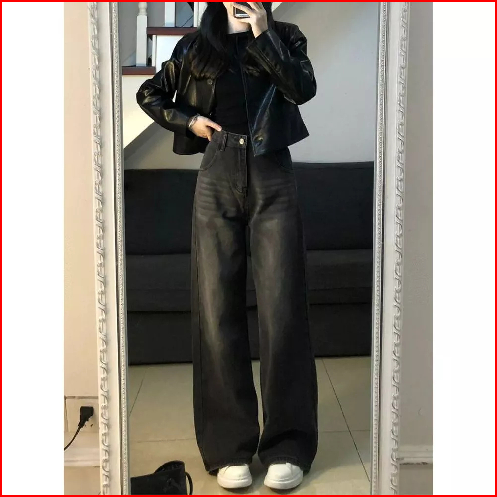 Celana Jeans Lurus Longgar Kelabu Hitam Wanita Highwaist Kulot Jeans Wanita Korean Style Celana Panjang Import