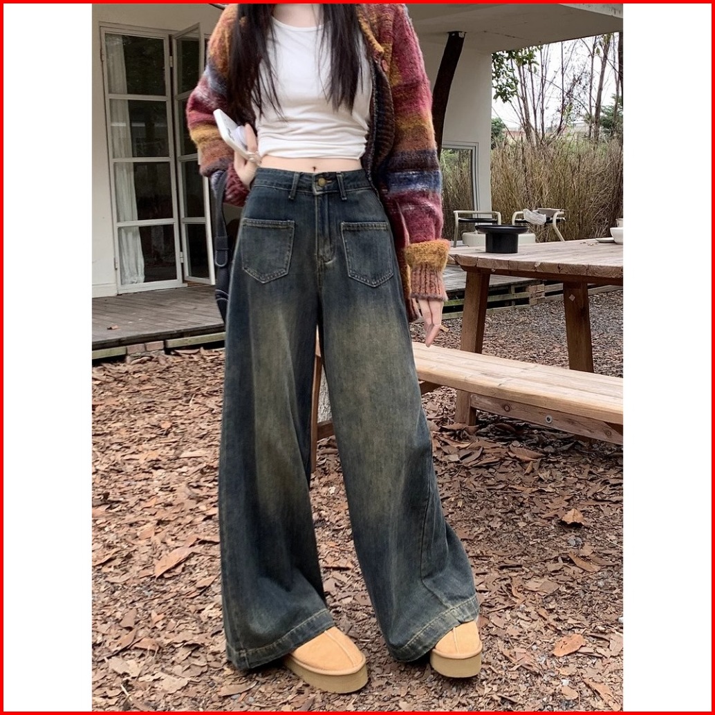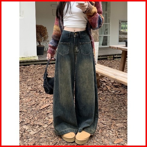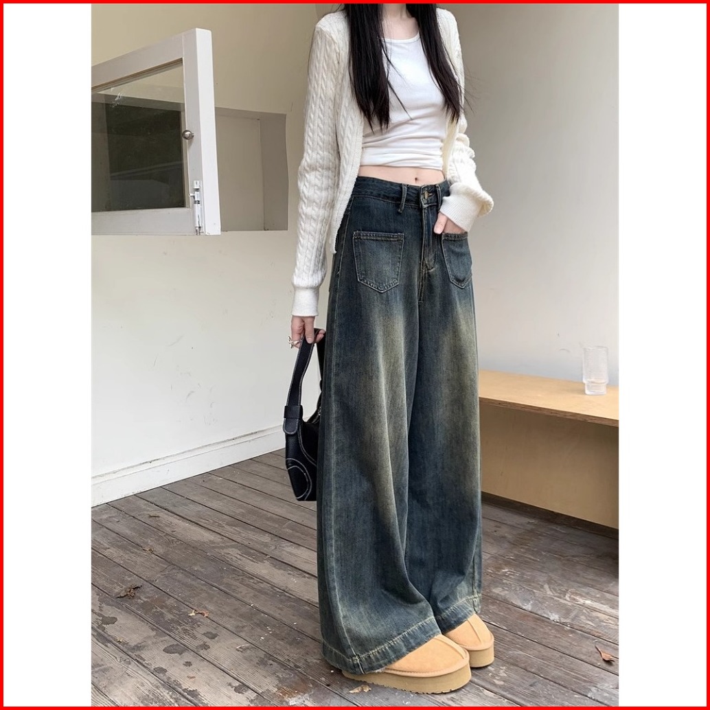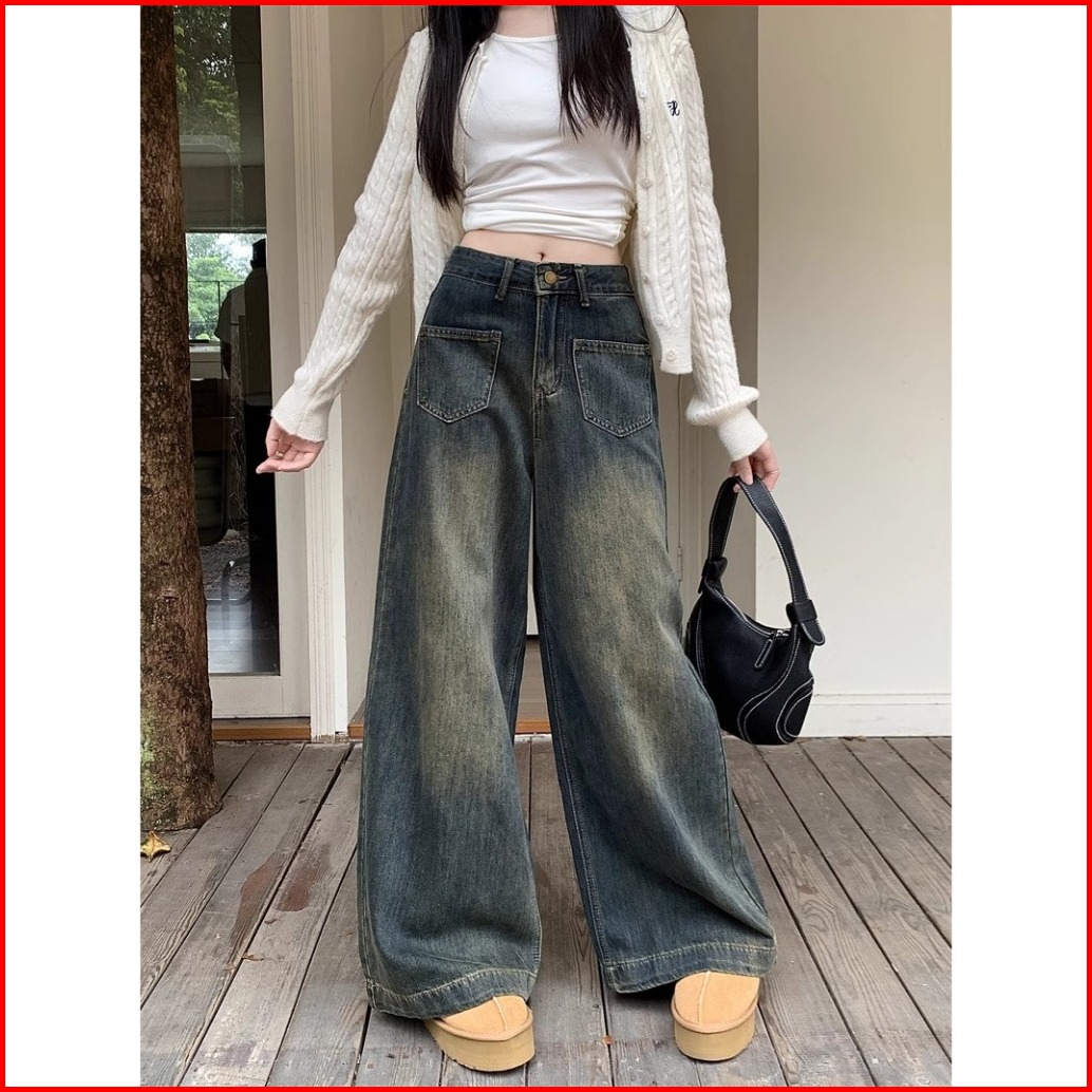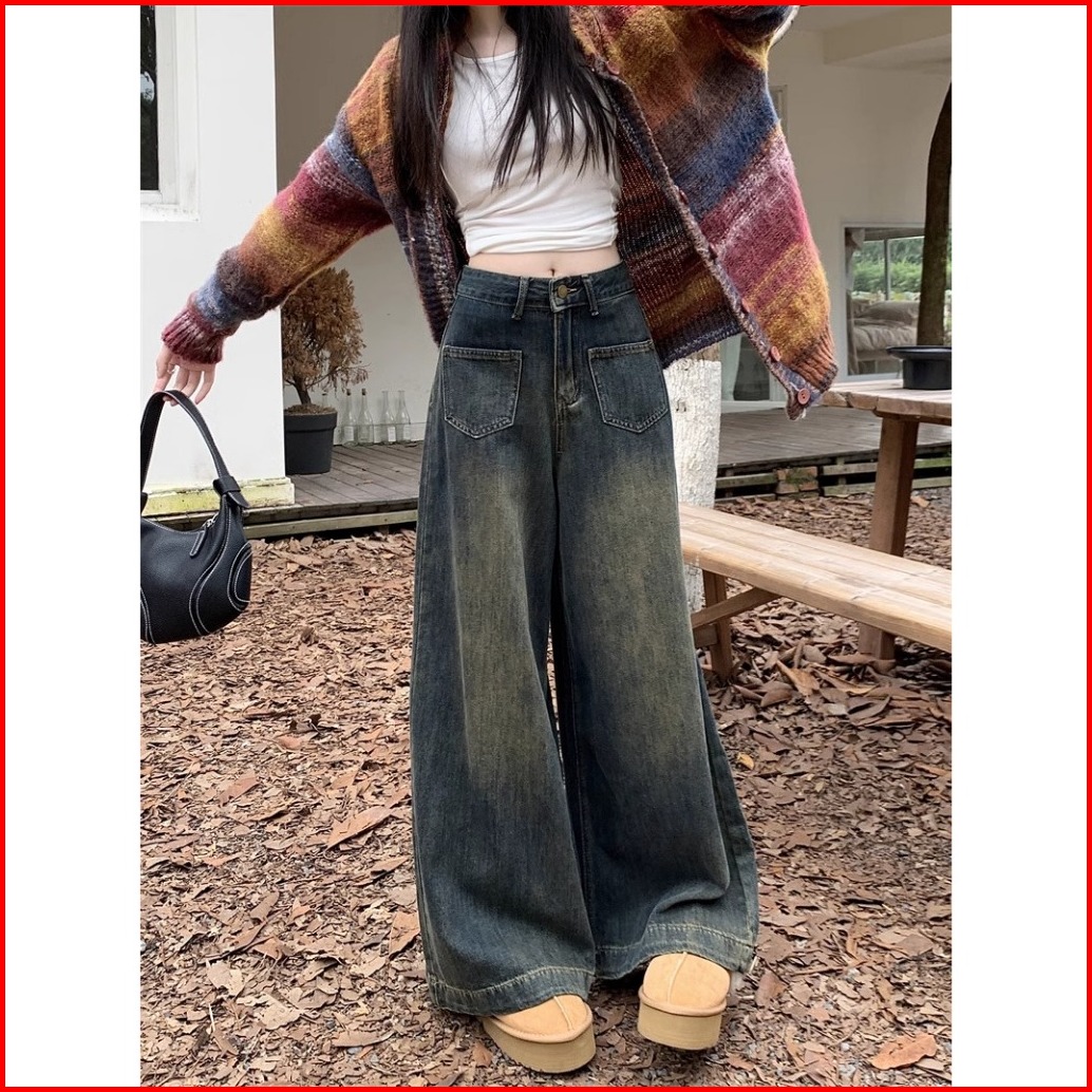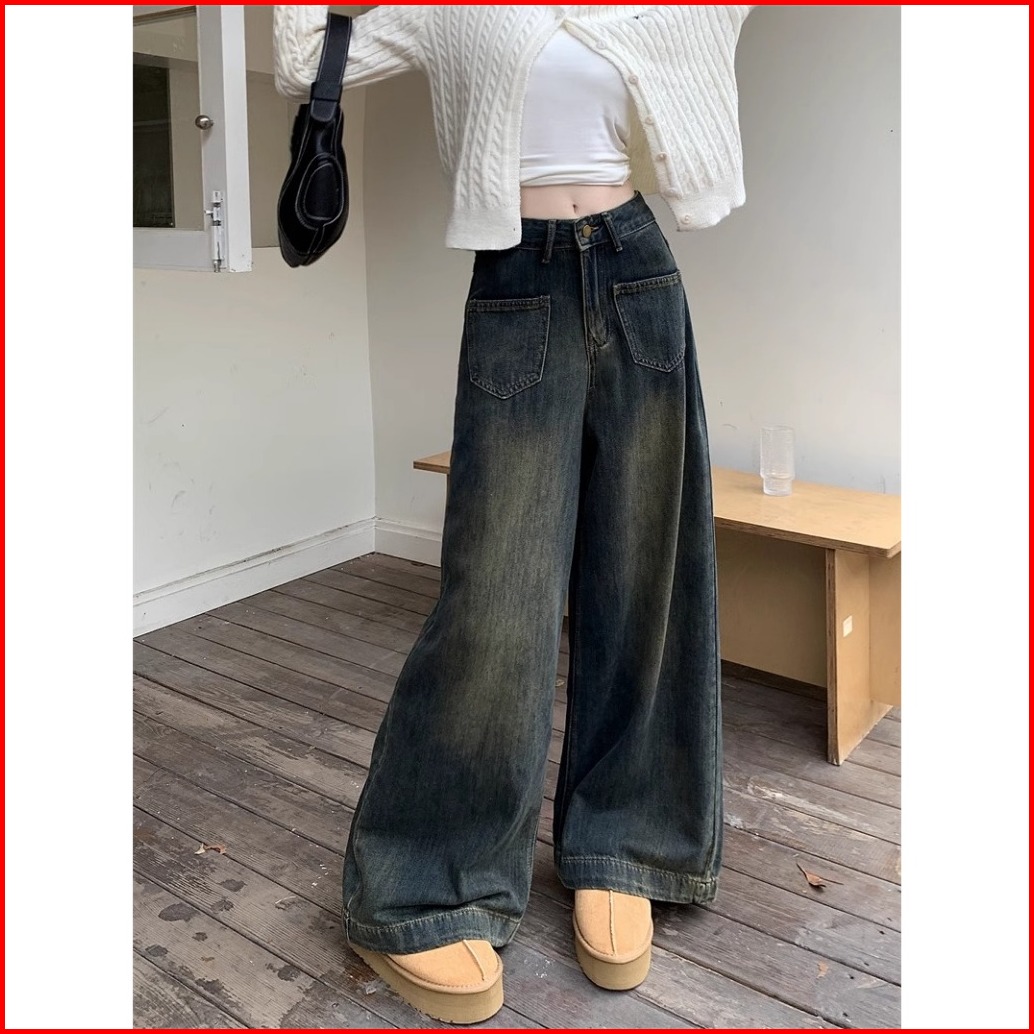 New Retro Biru High Waist Celana Lebar Kaki Wanita Korean Style Kulot Loose Jeans Celana Cutbray Wanita