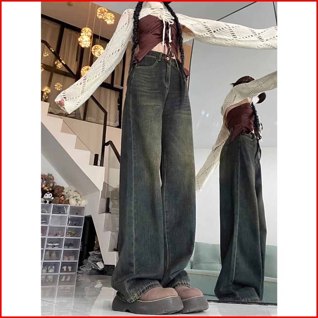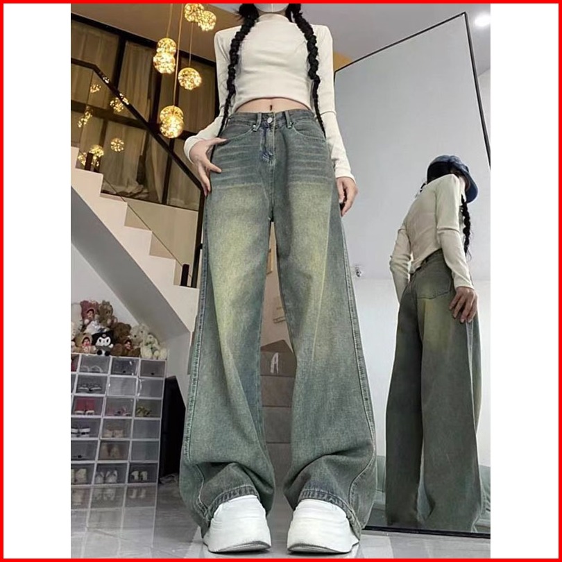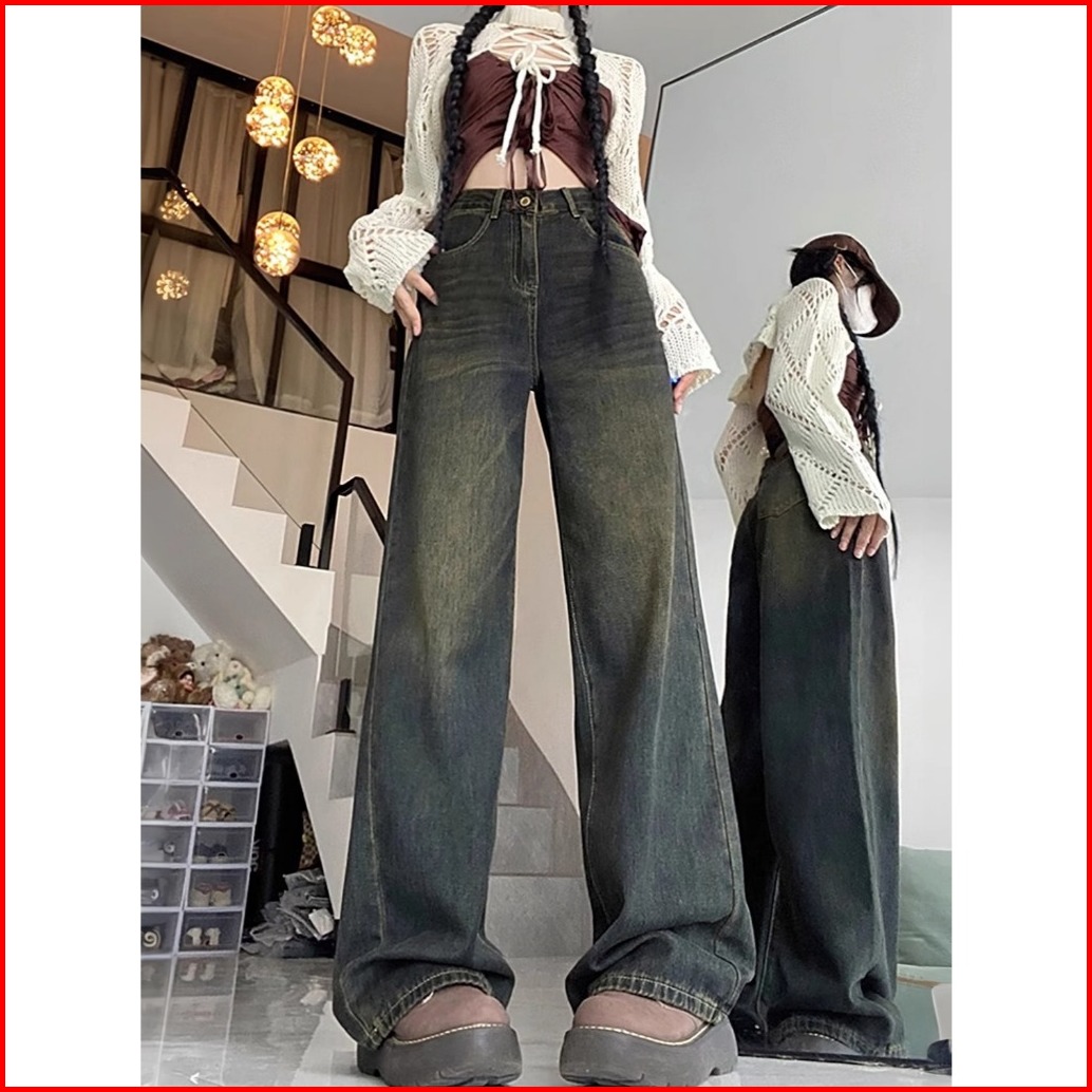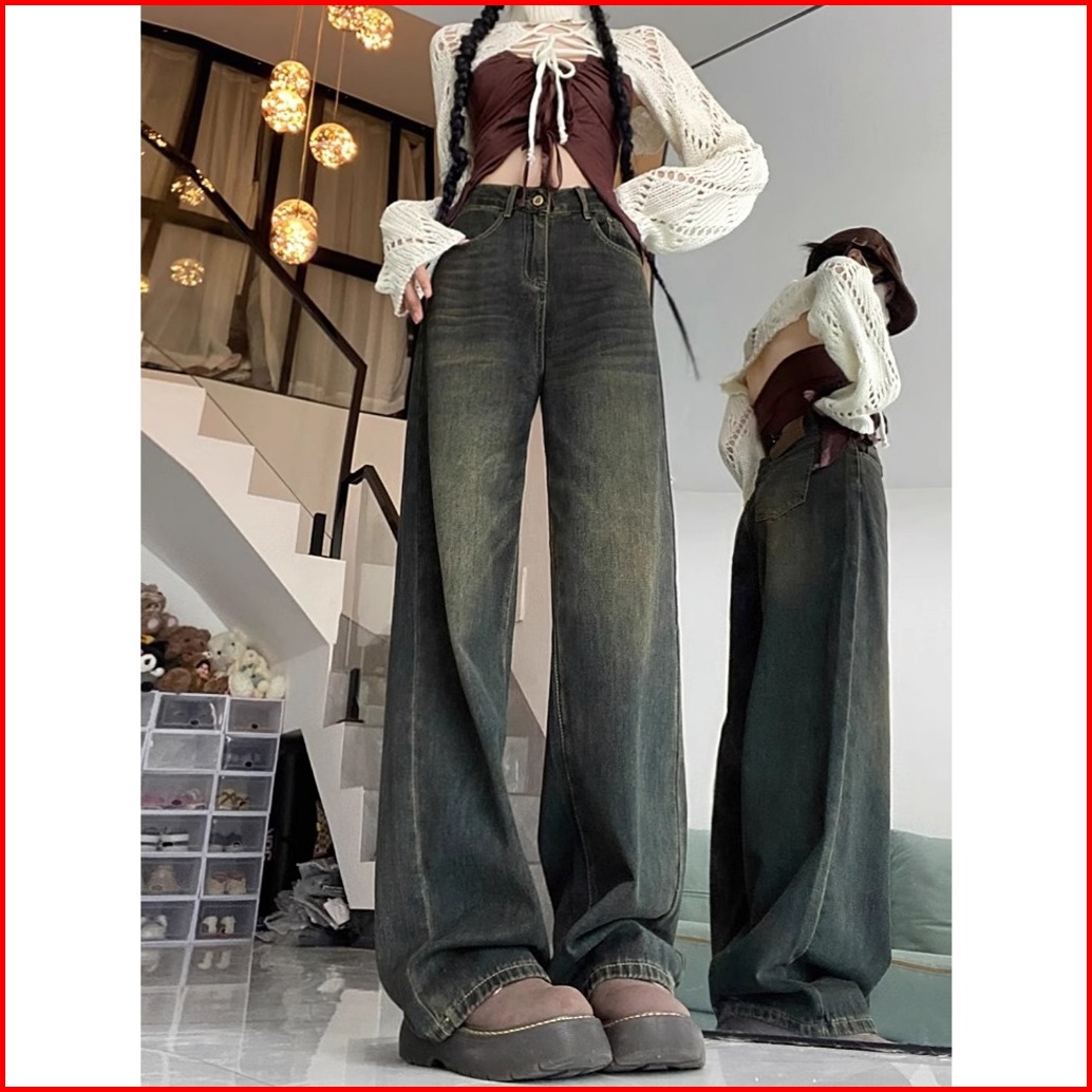 New High Waist Celana Jeans Wanita Korean Style Boyfriend Celana Kulot Retro Abu-abu Loose Jeans