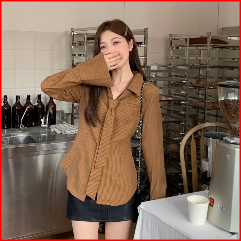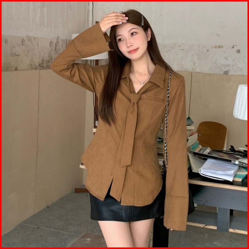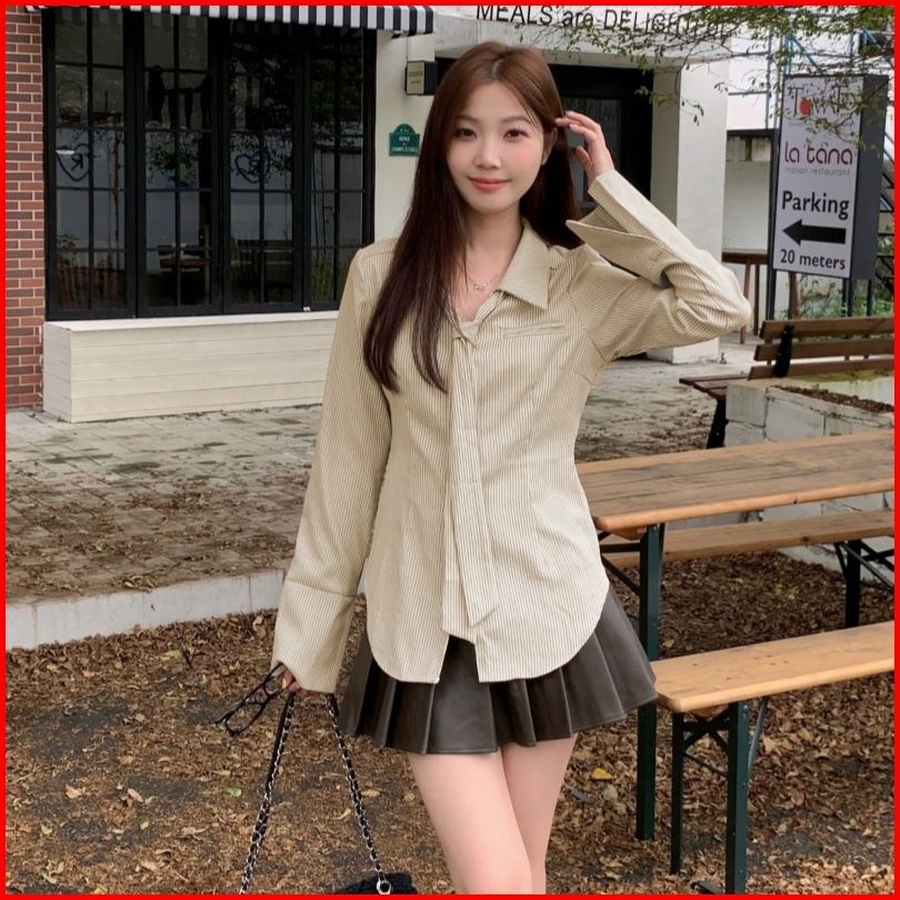 Yuruma Kemeja Lengan Panjang Bergaris Gaya Korea Kemeja Luar Pelangsing Pinggang Termasuk Dasi