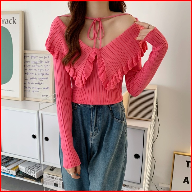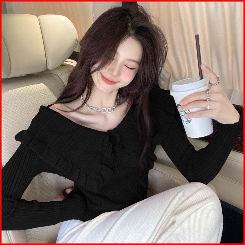 Ajw Atasan Wanita Blouse Double Ruflle Vneck Knit Premium Xeu Baju Wanita Sabrina Pita Lengan Panjang Blouse Knit Lengan