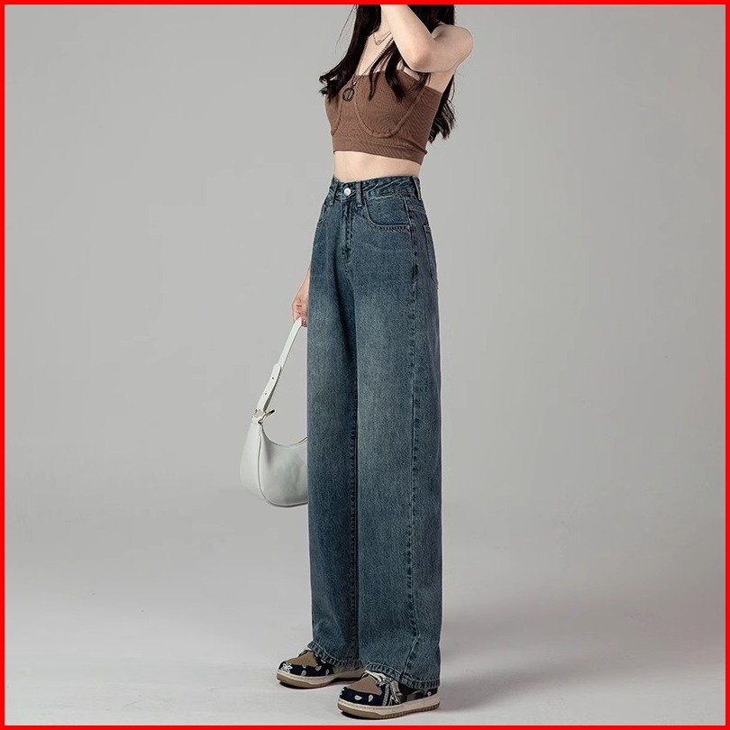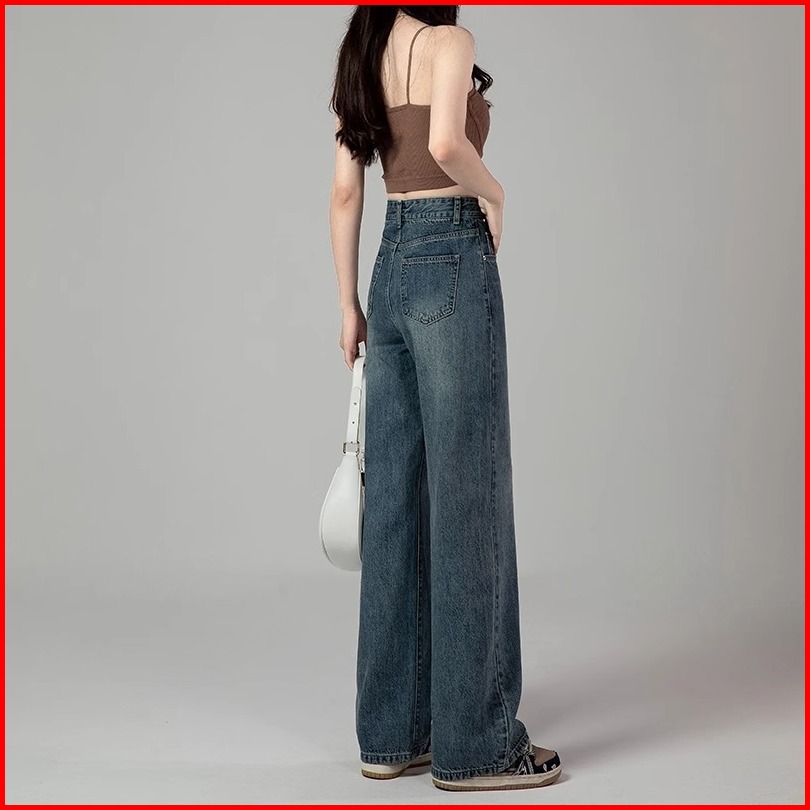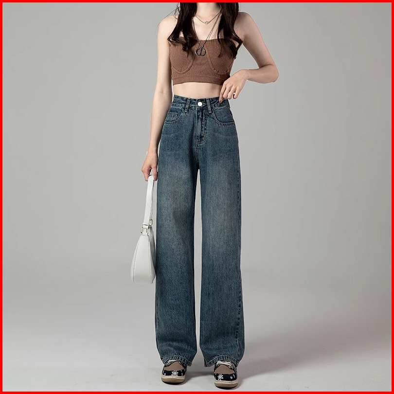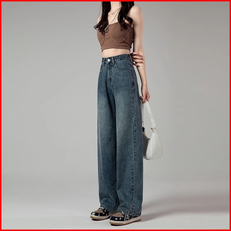 Retro Highwaist Celana Jeans Wnaita Kekinian Korean Style Celana Panjang Straight Loose Wanitia