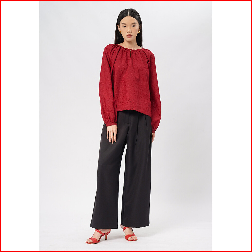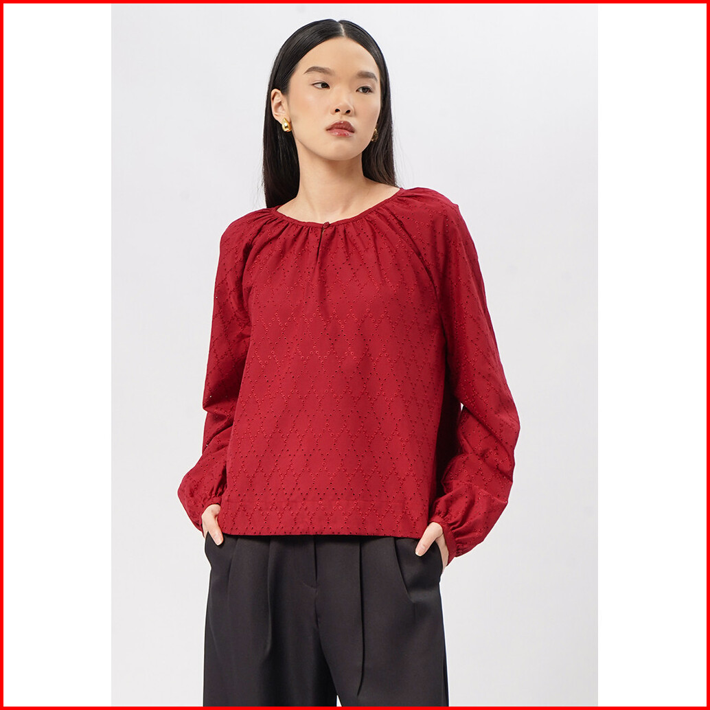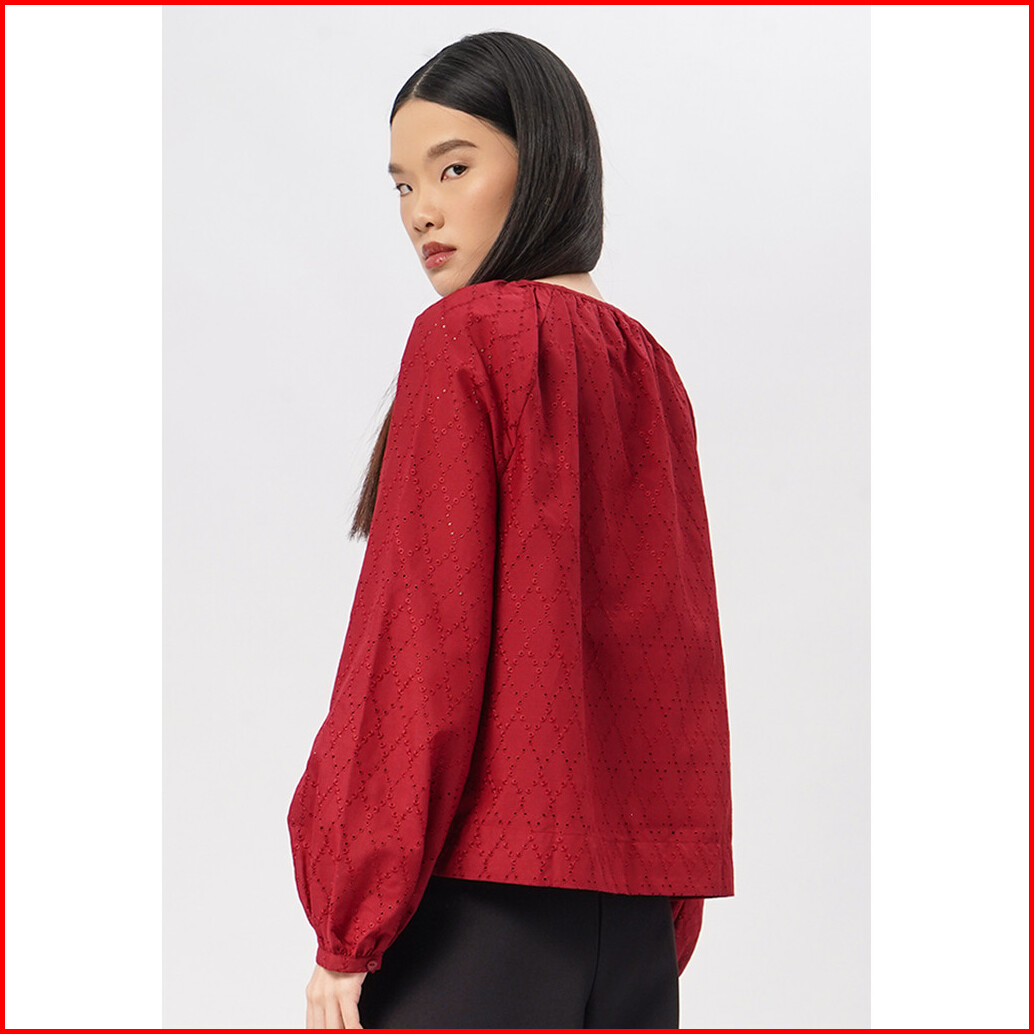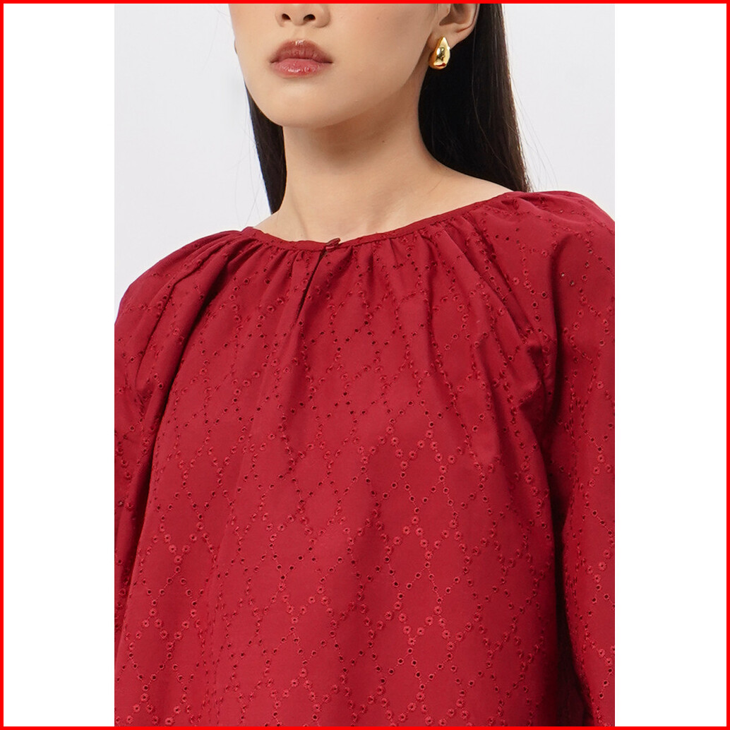Executive Puff Sleeves Eyelet Blouse Dark Red