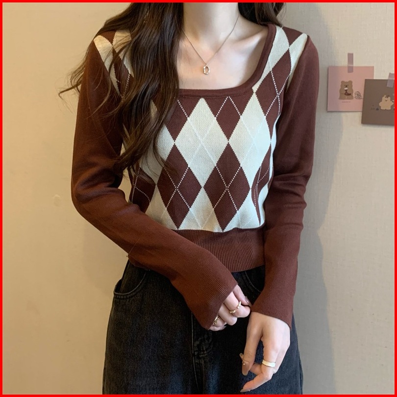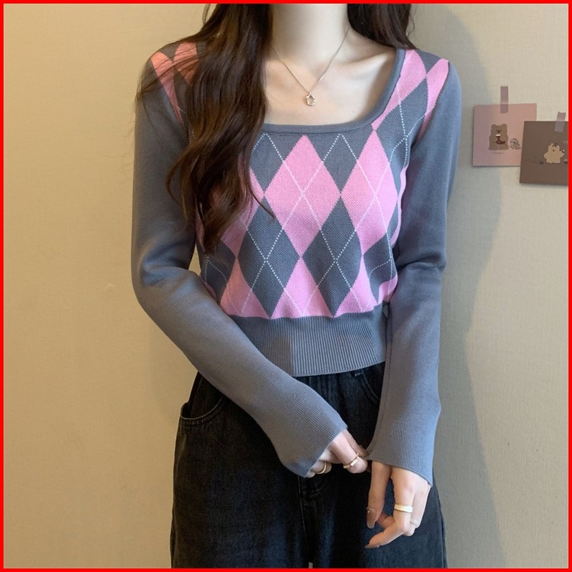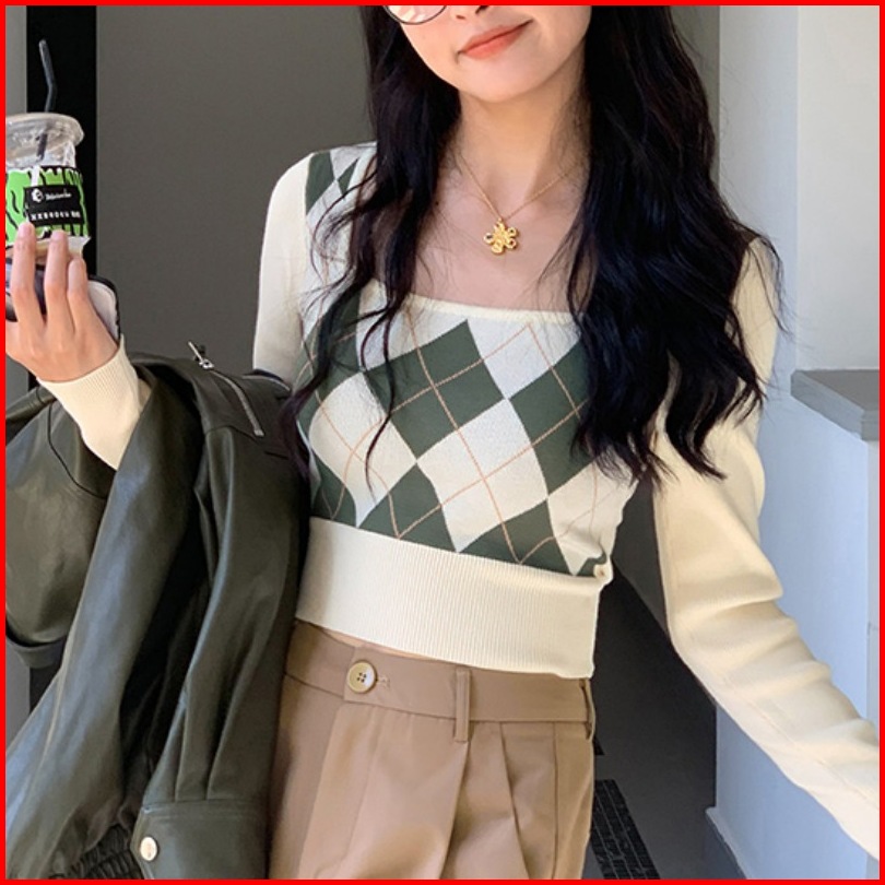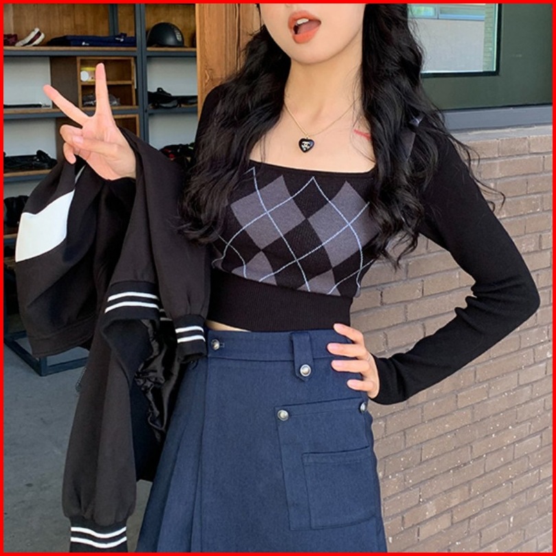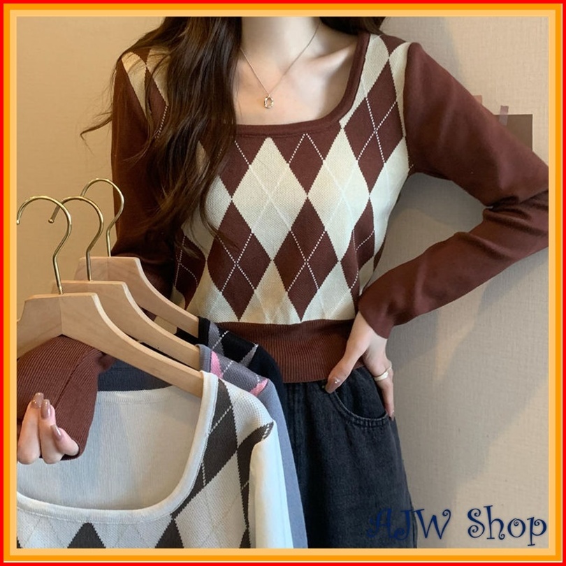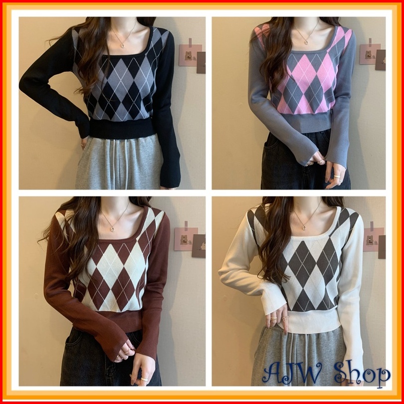 Ajw Crop Top Lengan Panjang Korean Style Kekinian Xbf Atasan Crop Wanita U Neck Lengan Panjang Rajut Import Crop Rajut L
