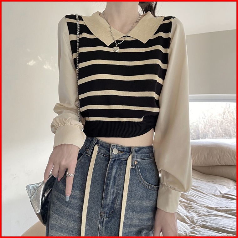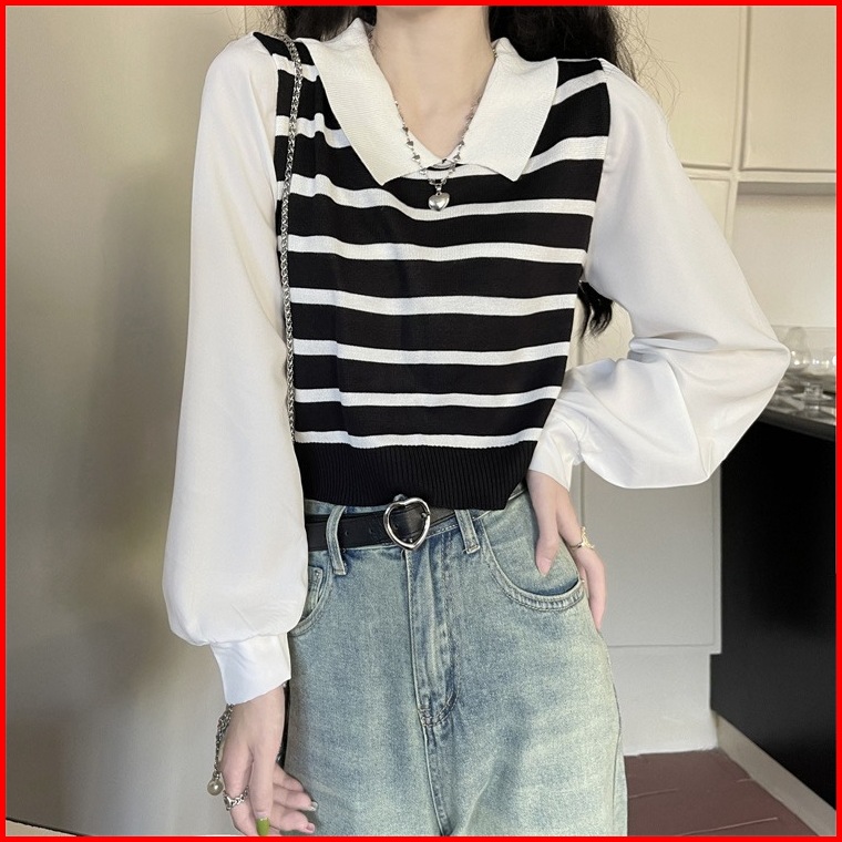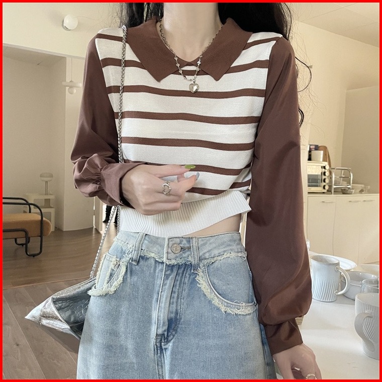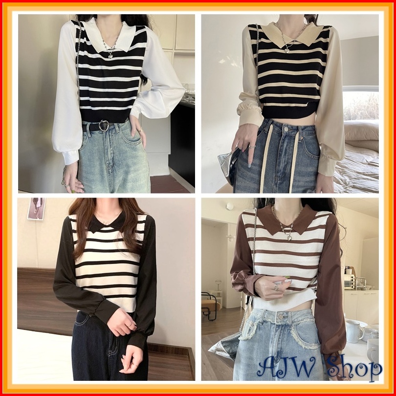 Ajw Blouse Wanita Striped Lengan Panjang Knit Premium Xef Atasan Wanita Striped Berkerah Lengan Transparan Premium Baju