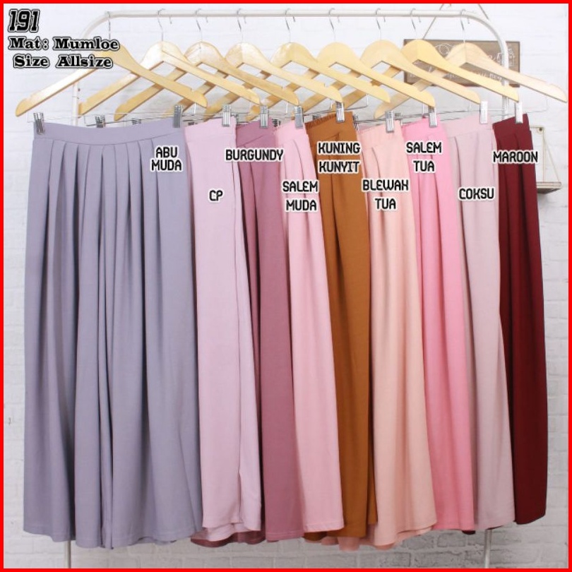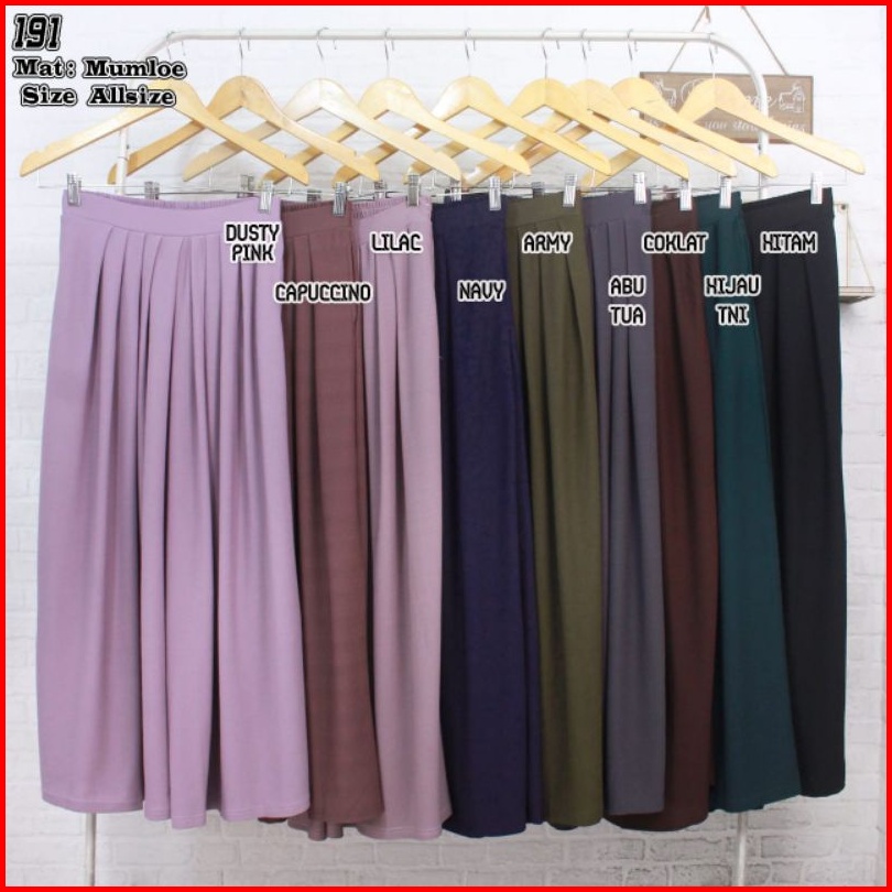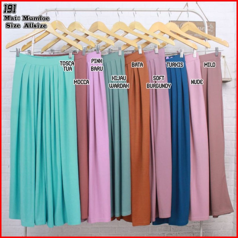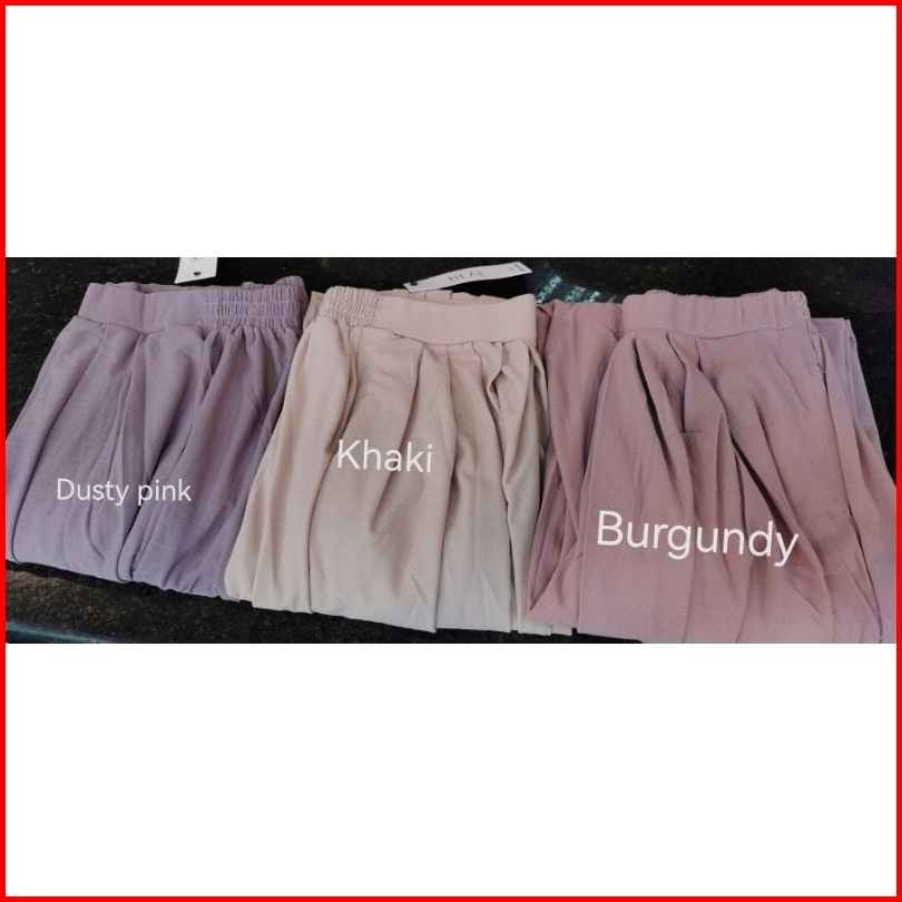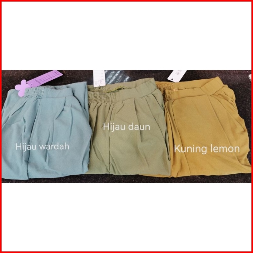 Hitam, Salem muda, Salem tua, Baby pink, Abu Tua, Abu muda, Khaki, Milo, Navy, Marun, Putih, Bata, Hijau Tua, Coklat tua, Kunyit, TNI, Lemon, Tosca tua, Burgundy, Lilac, Cappucino, Mocca, Dusty Pink, Lavender, Nude, Coksu, H. Wardah, Blewahtua, Turkis, Biru indigo, Pink baru, Army