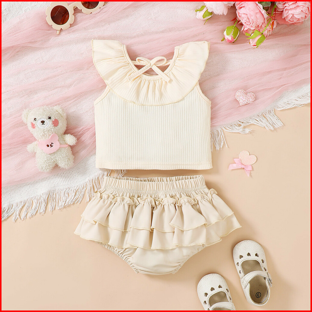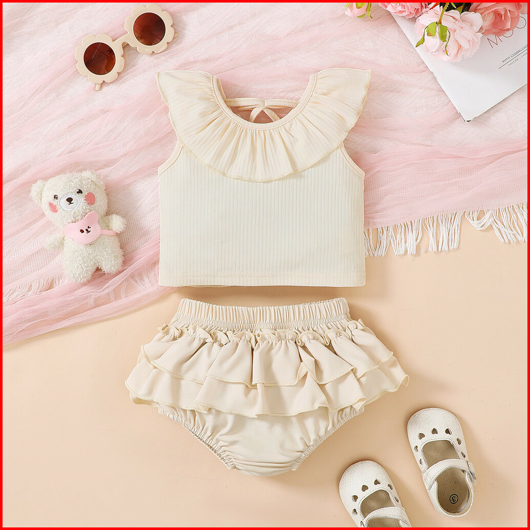 Haasya Kids 0-3years Infant Baby Girl Summer 2pcs Clothes Set Solid Ruffle Sleeveless Ribbed Top With Tiered Skirt Toddl