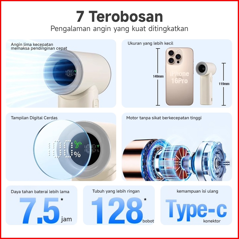 Mini Kipas Angin Turbo Strong Portable Handheld Rechargeable Mini Fan Lipat High Speed 17400rpm