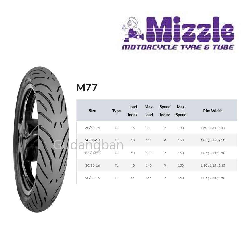 90 80 ring 16 Ban Mizzle M77 ban Motor Nouvo Skywave Tubeless FREE PENTIL