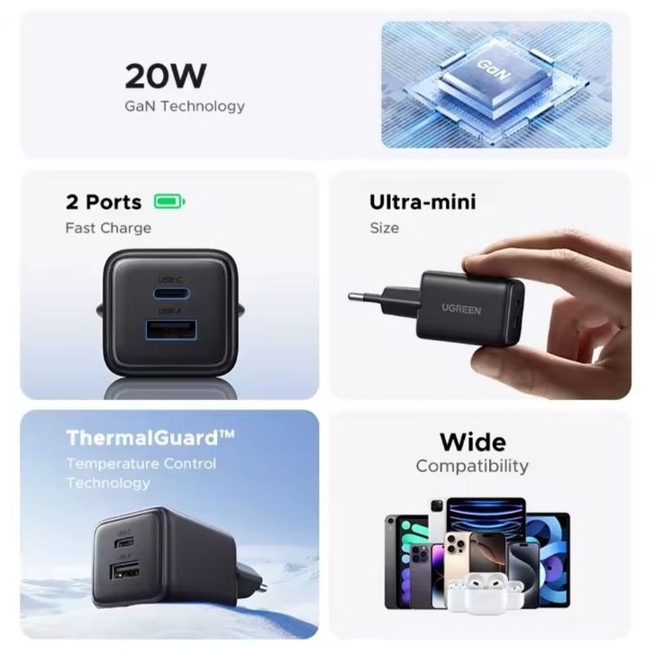 UGREEN Kepala Charger Casan type C + USB Gan 20W Faat Charging